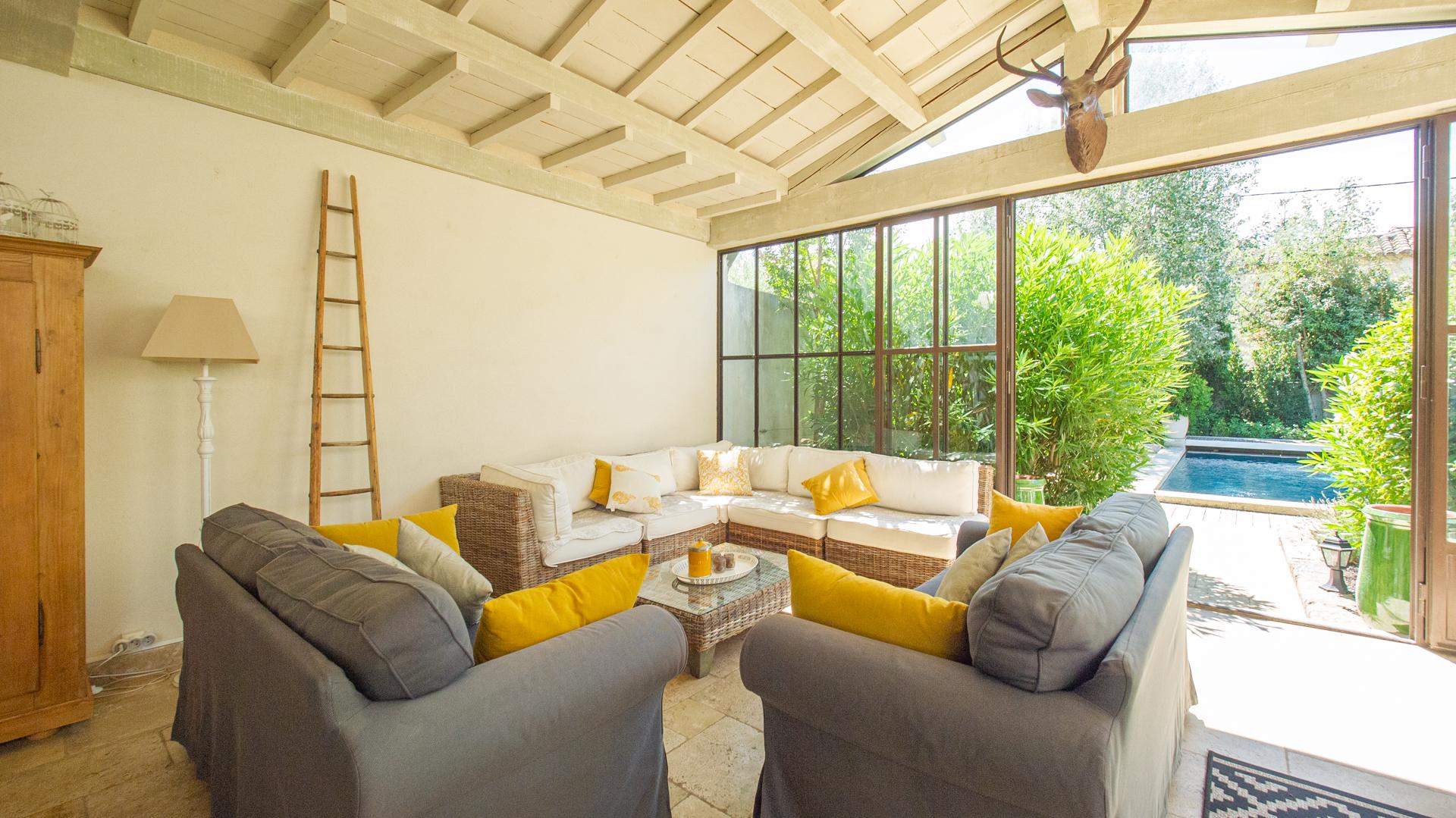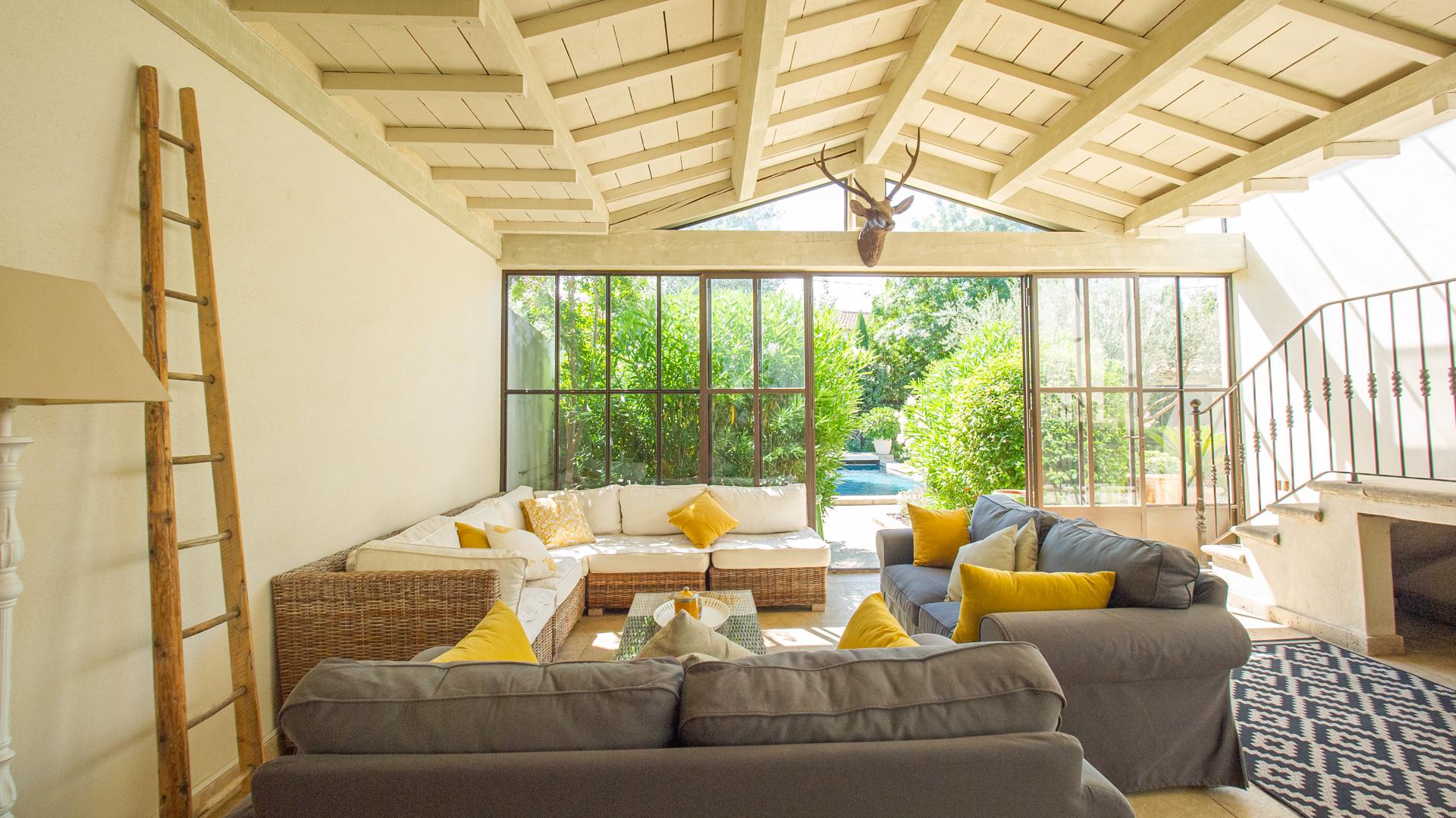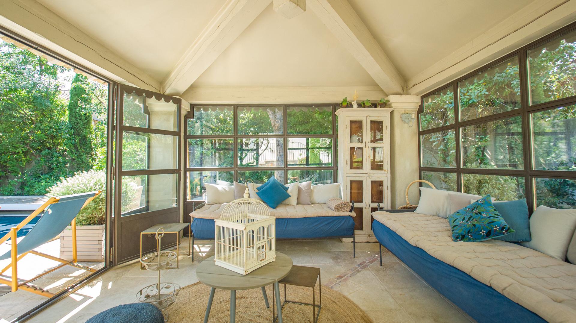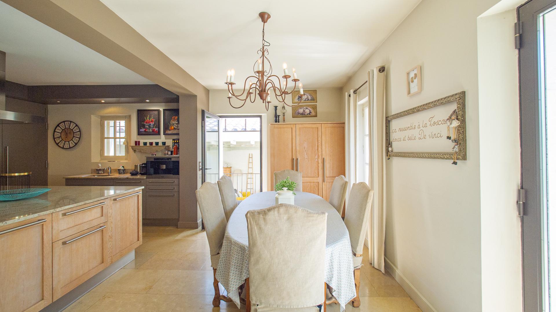 Inside, the Provençal-chic atmosphere is in order. The double living room grouping the open kitchen with dining area and the living room is warm.