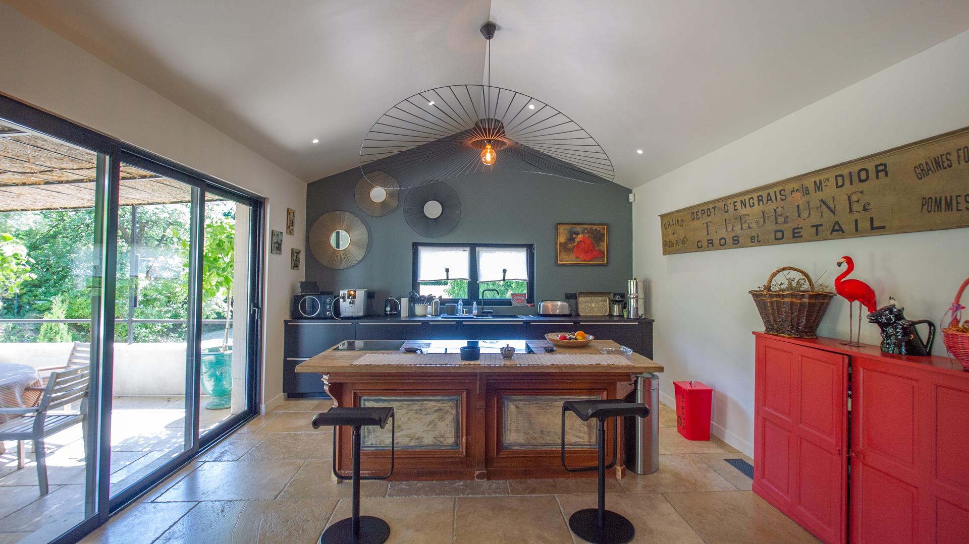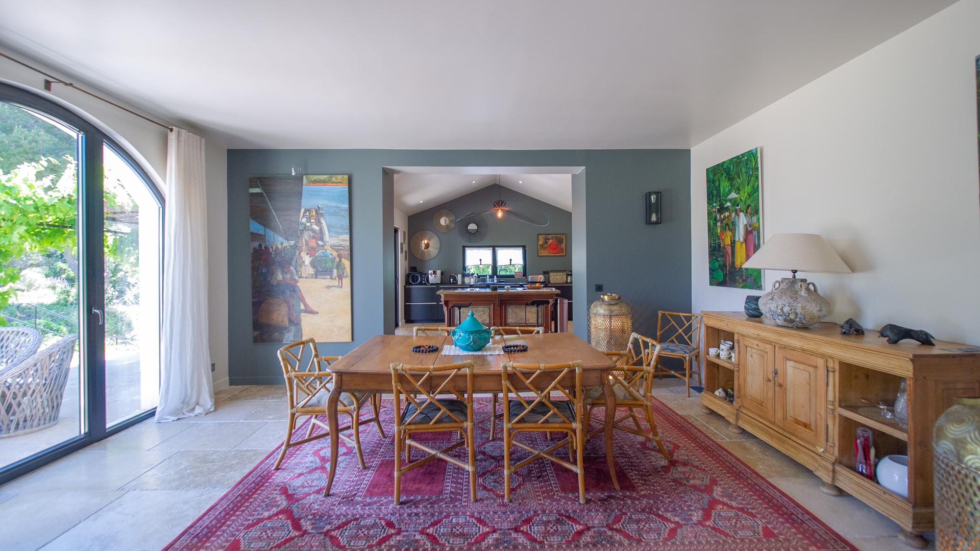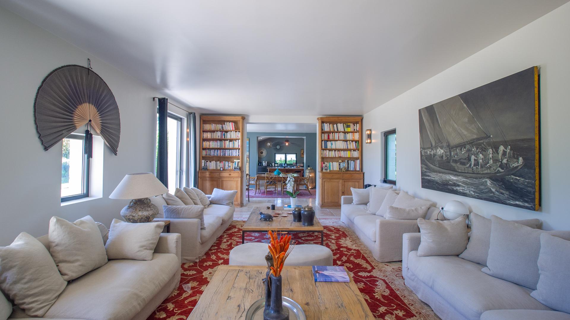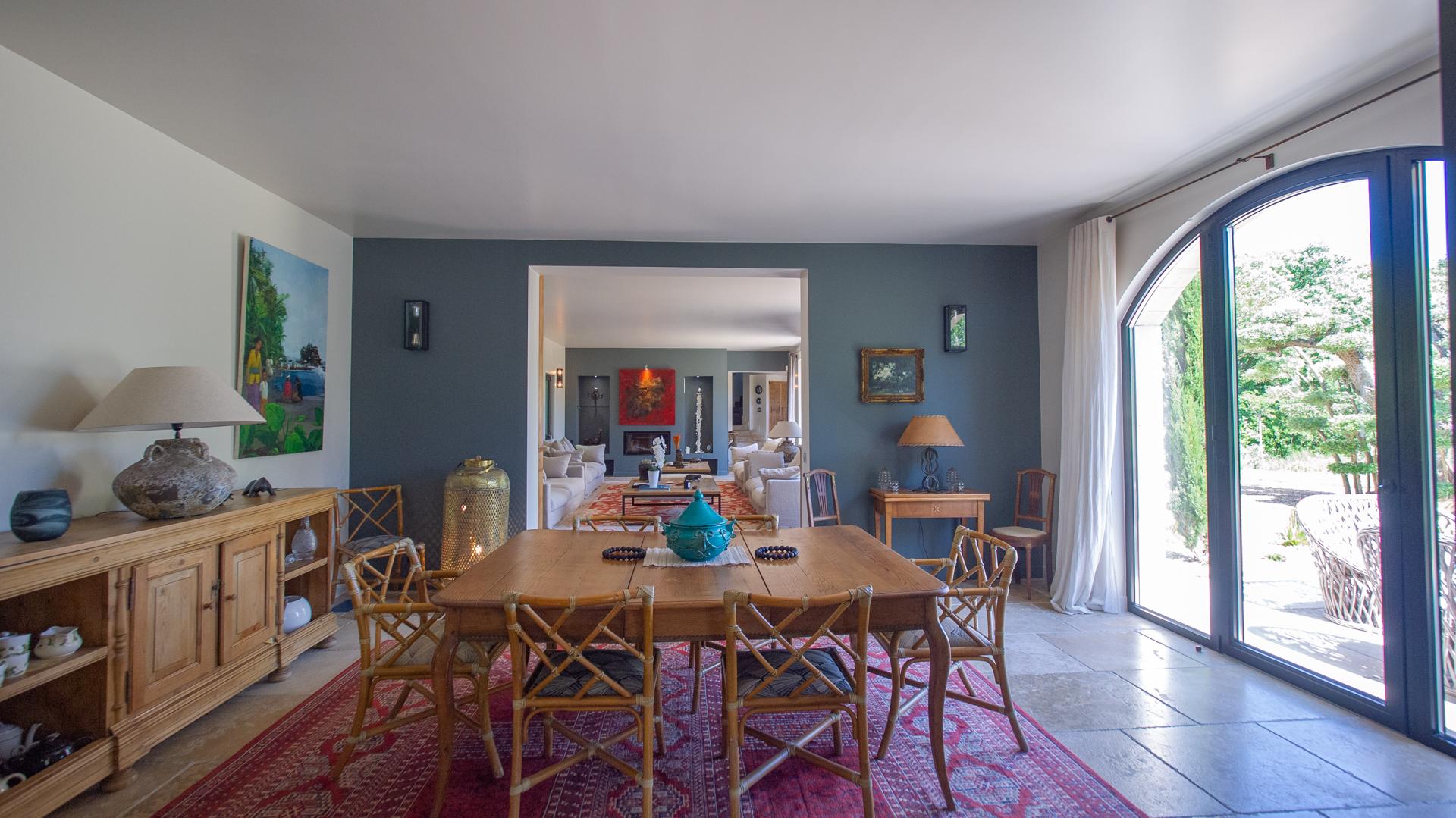 The chic and comfortable living room invites guests to relax, read, watch movies or listen to music via a high quality HIFI system. The entire ground floor is very bright and fully opens onto the Alpilles.