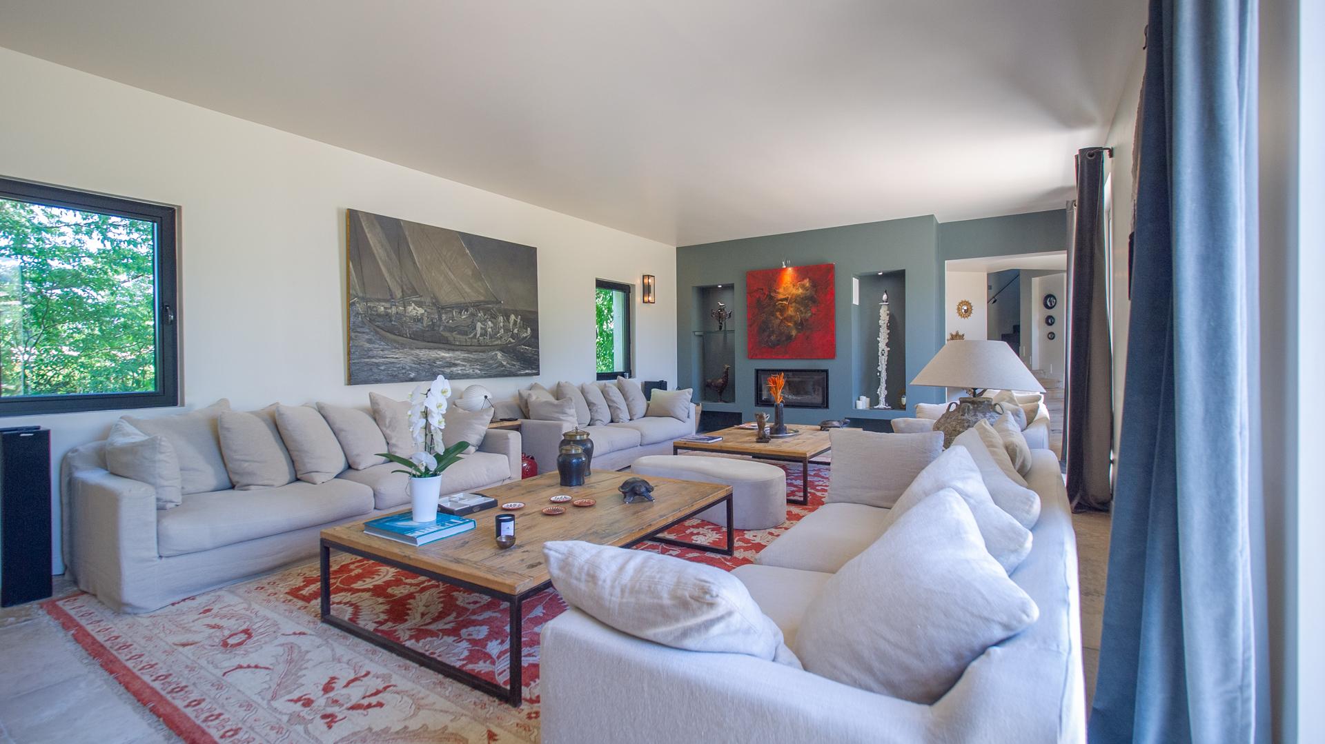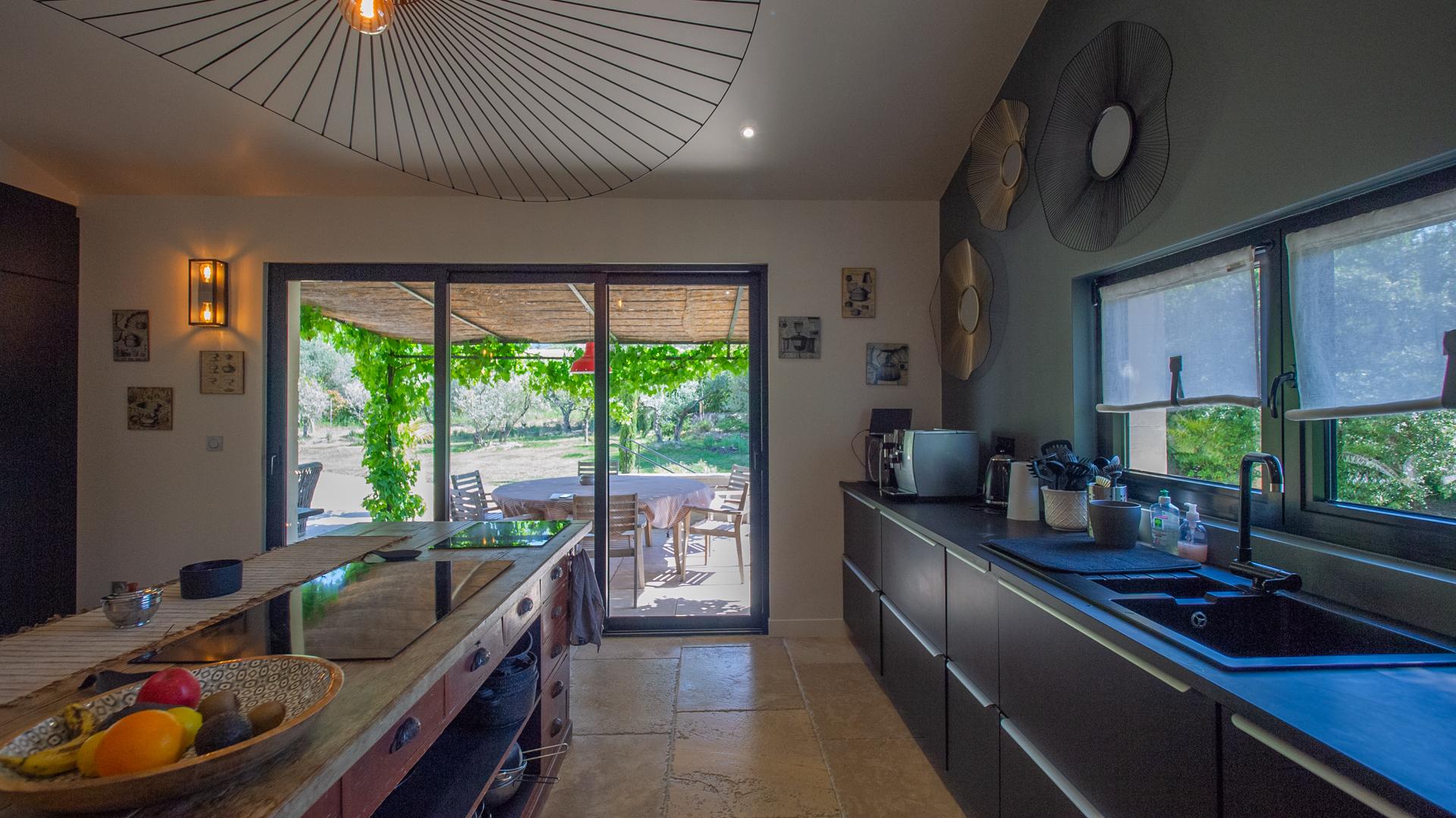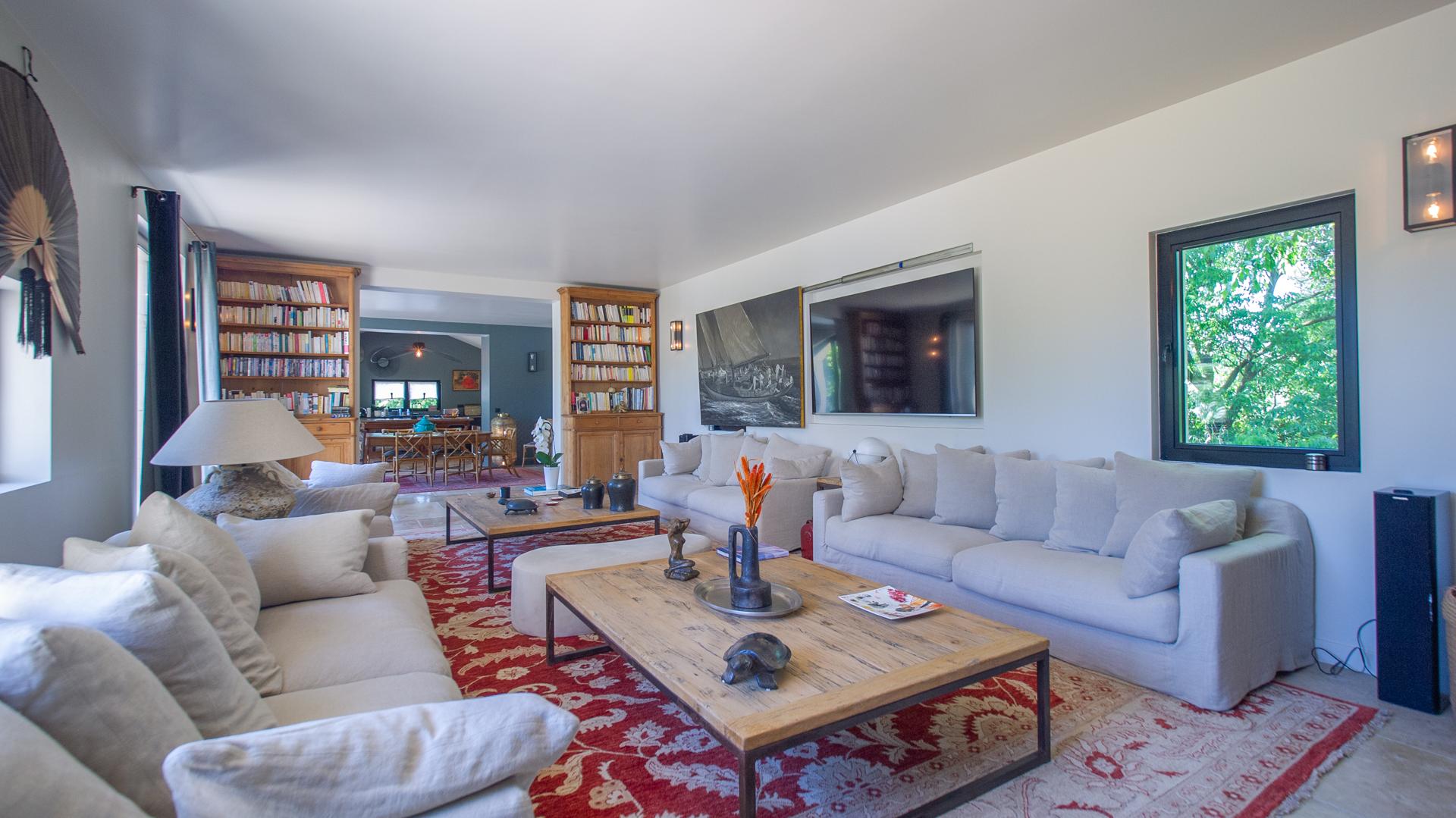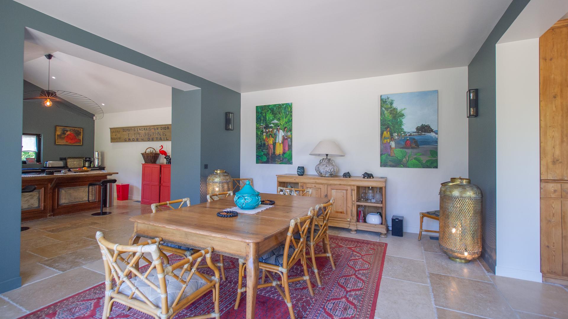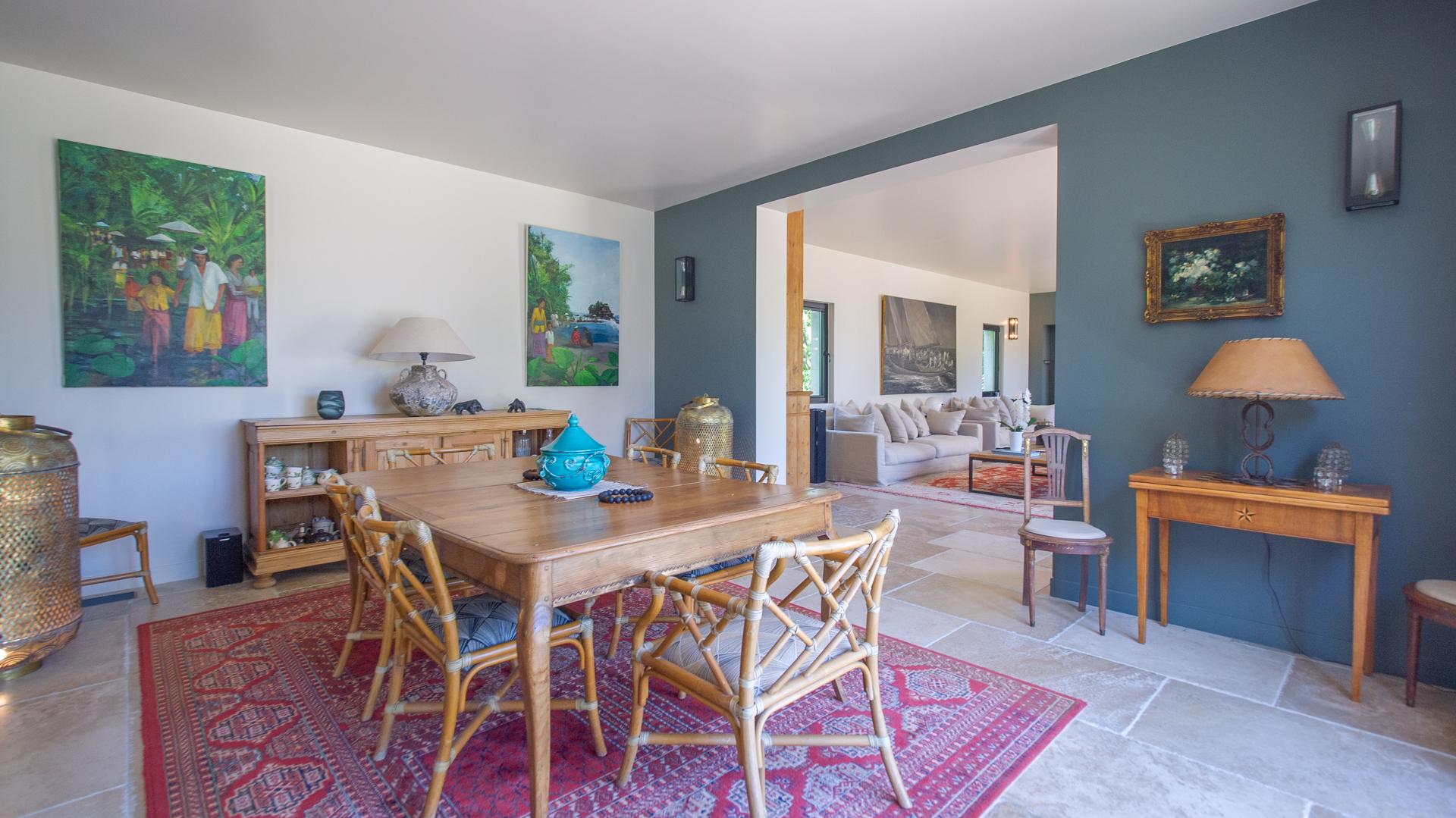 The chic and comfortable living room invites guests to relax, read, watch movies or listen to music via a high quality HIFI system. The entire ground floor is very bright and fully opens onto the Alpilles.