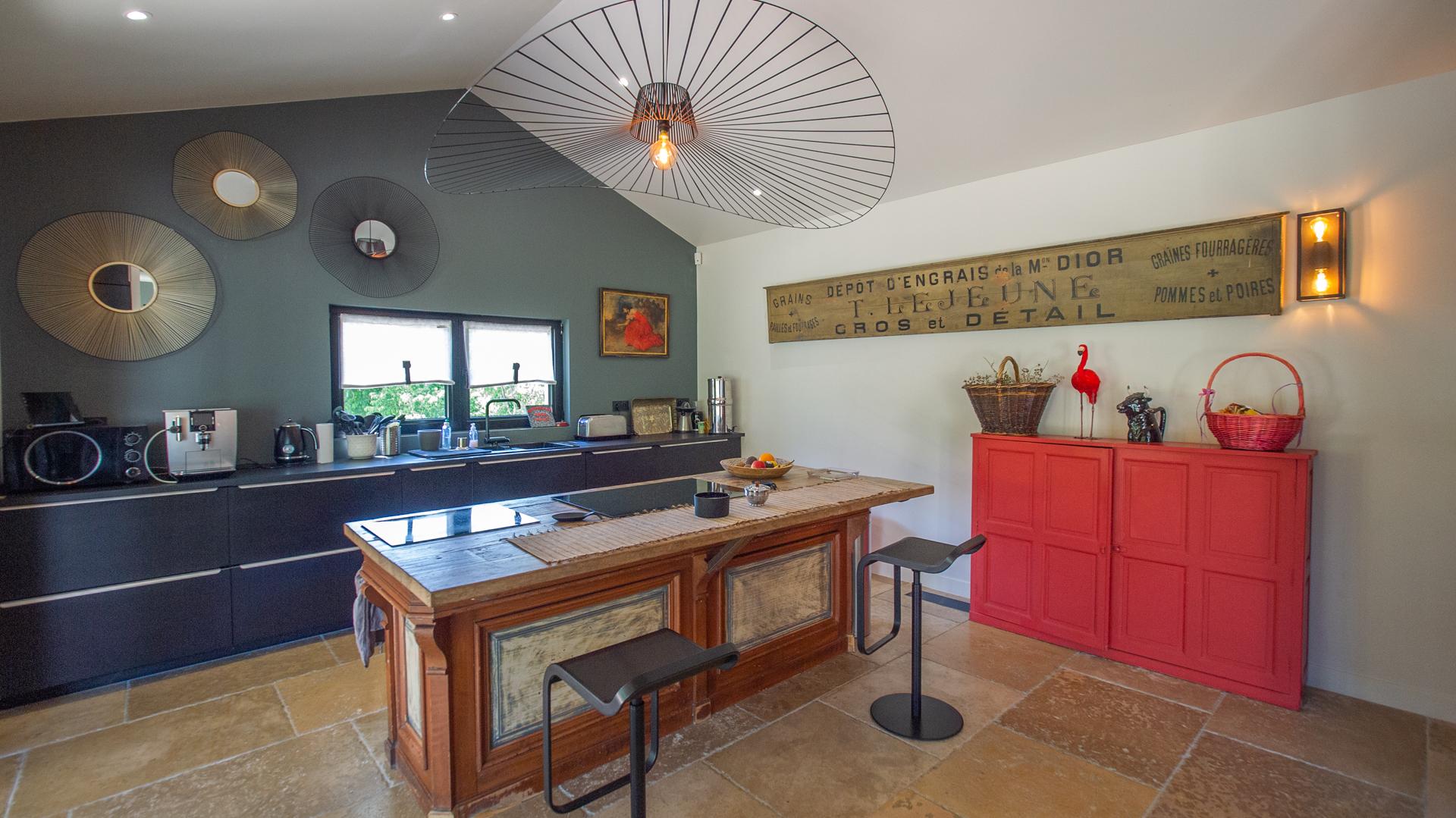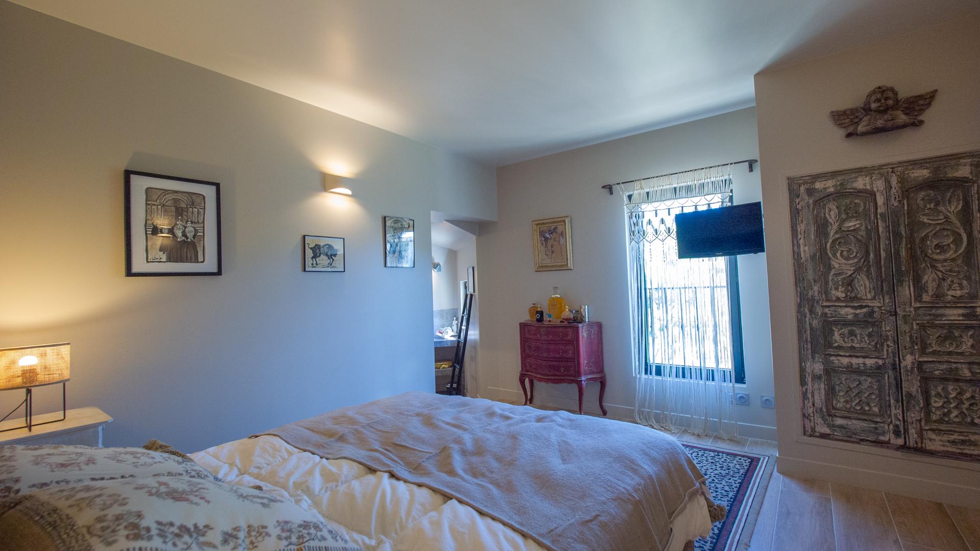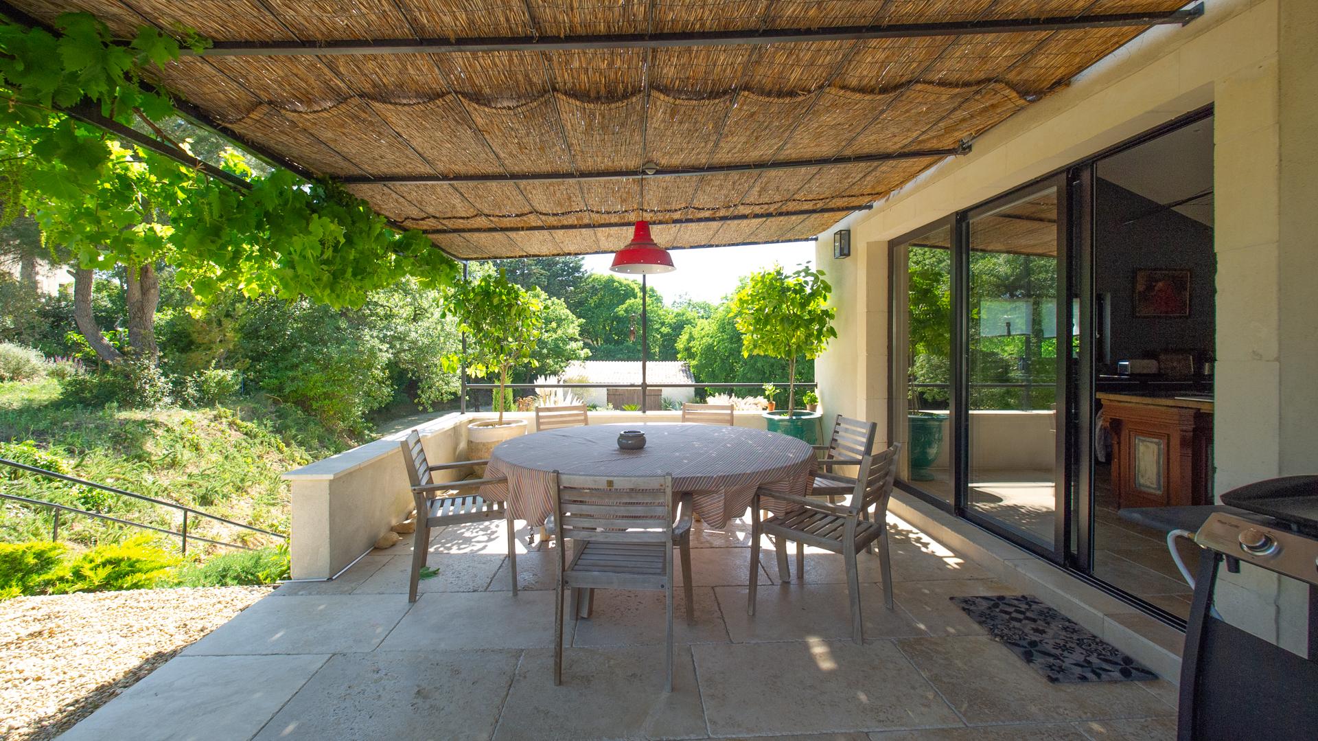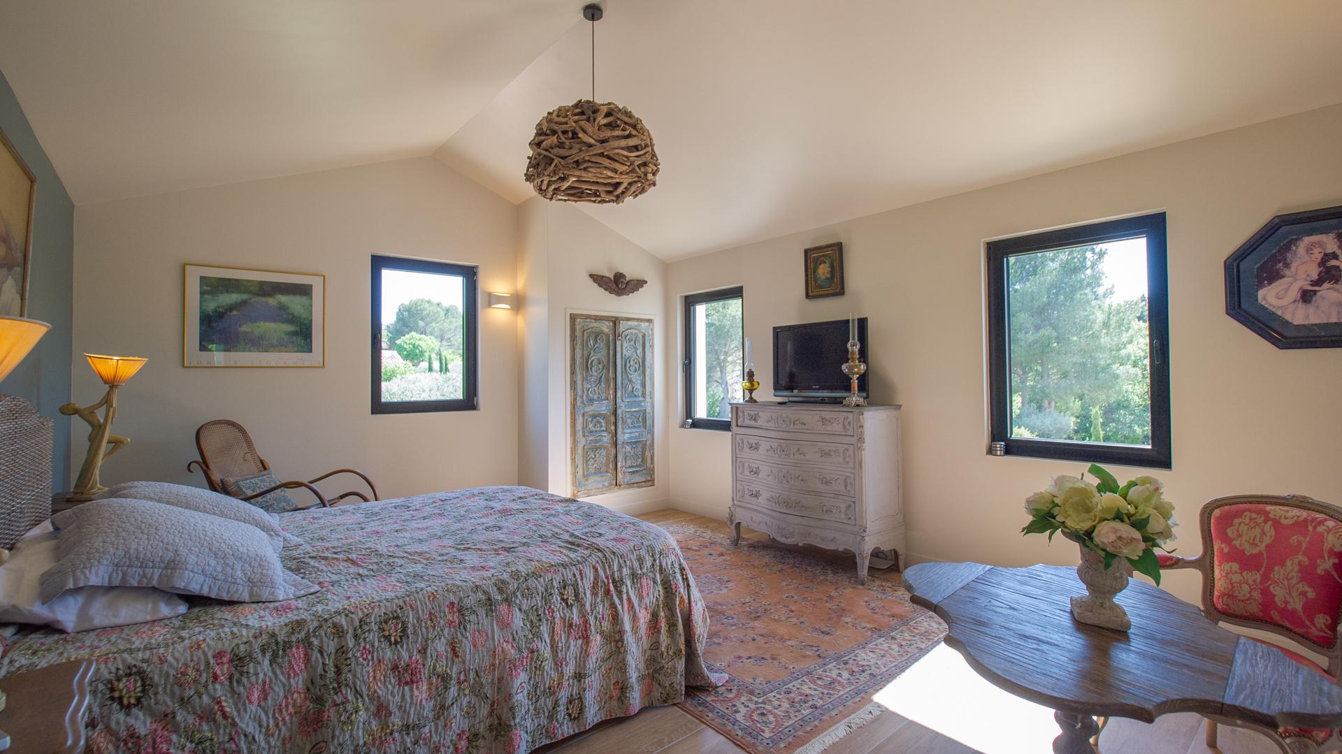 The chic and comfortable living room invites guests to relax, read, watch movies or listen to music via a high quality HIFI system. The entire ground floor is very bright and fully opens onto the Alpilles.