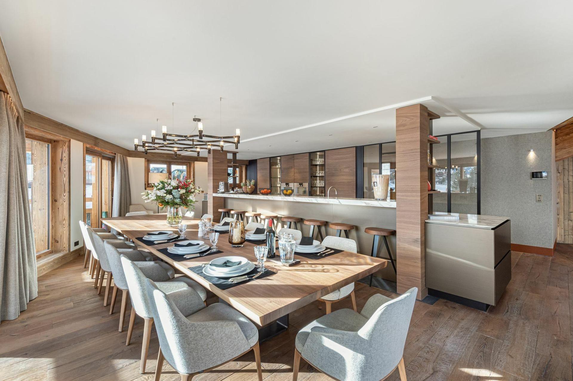 A perfect balance between alpine architecture and contemporary ambiance and decor, the ground floor boasts a bright living area with a fully equipped kitchen, a lounge, and a dining room with a balcony.