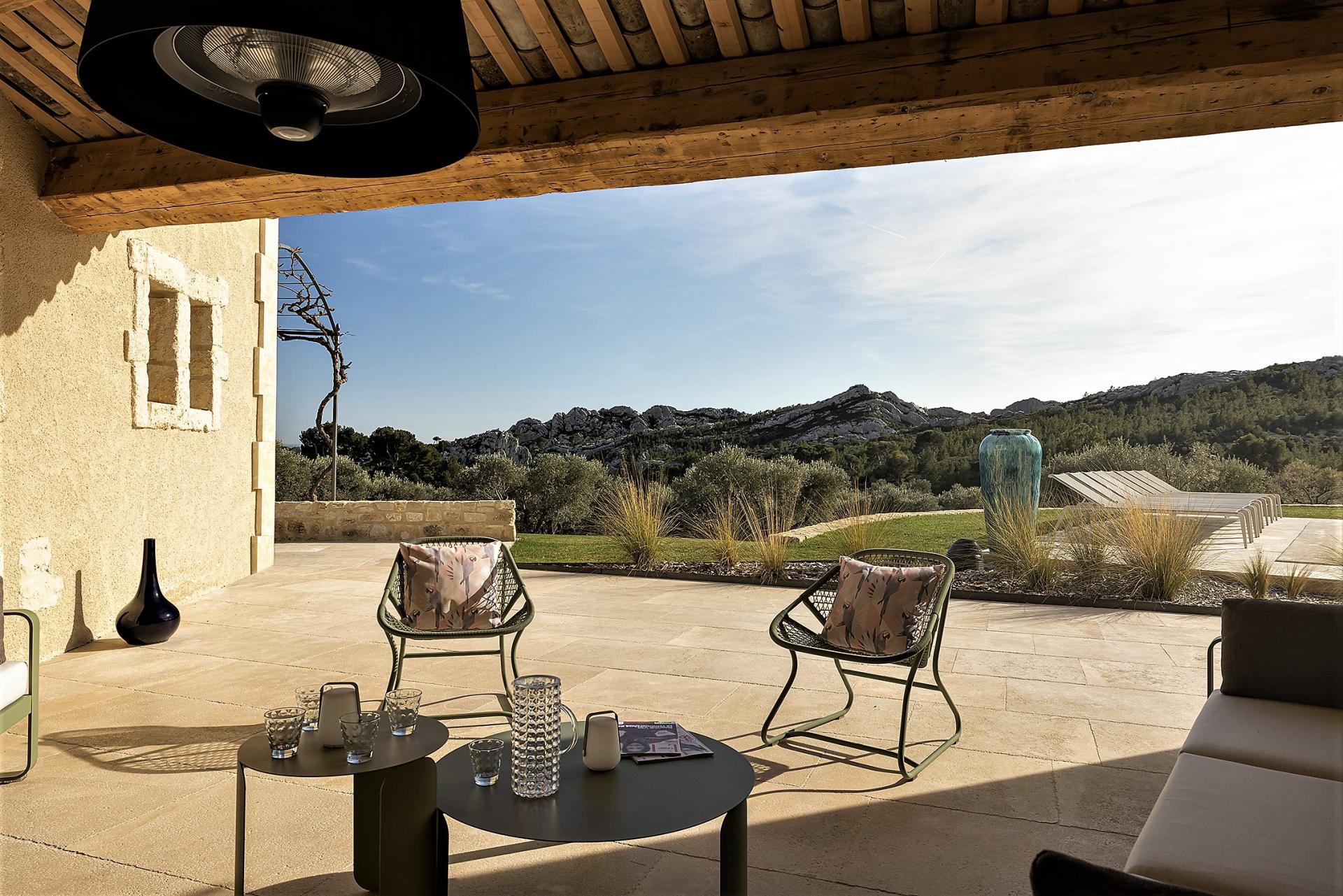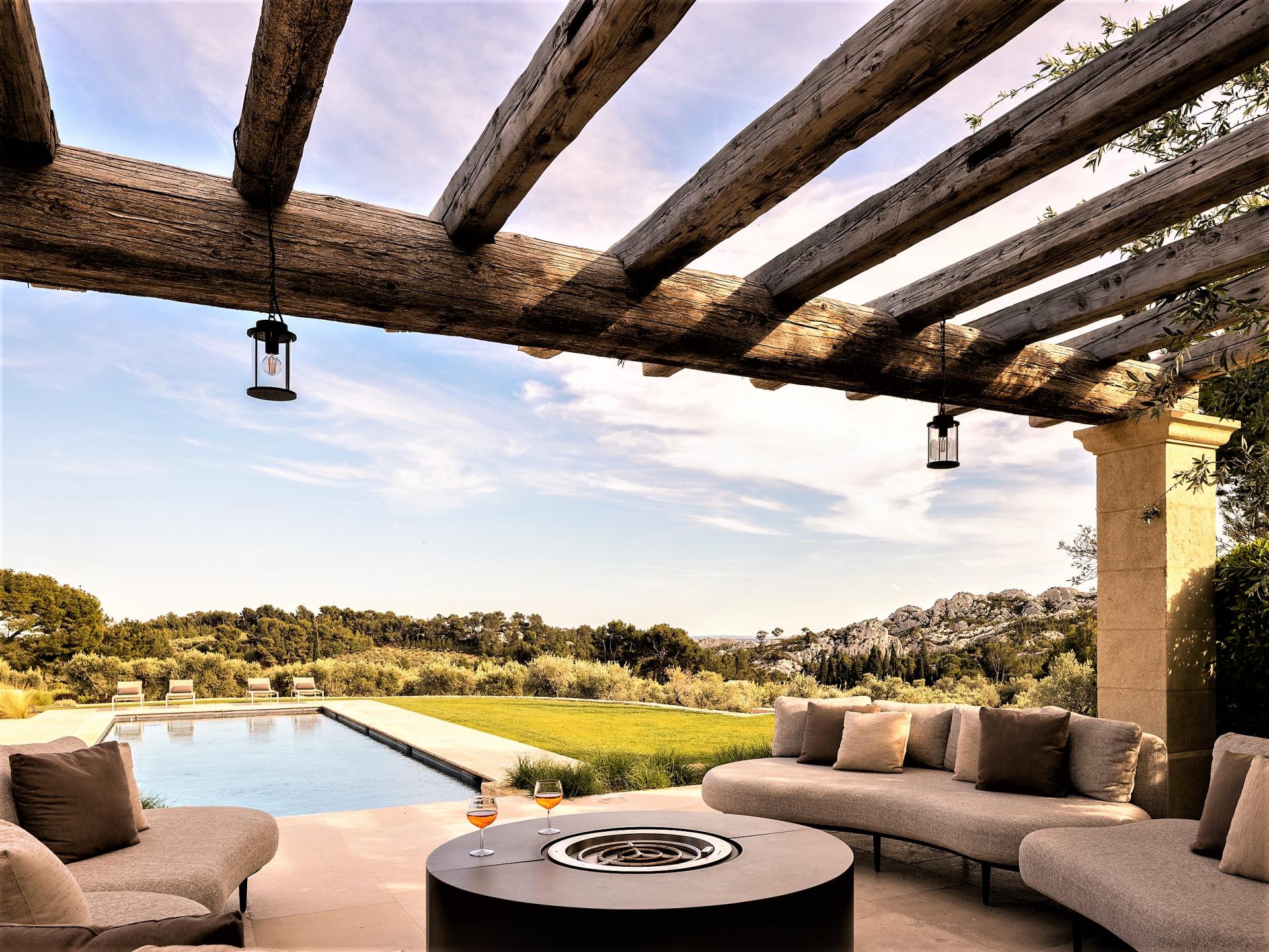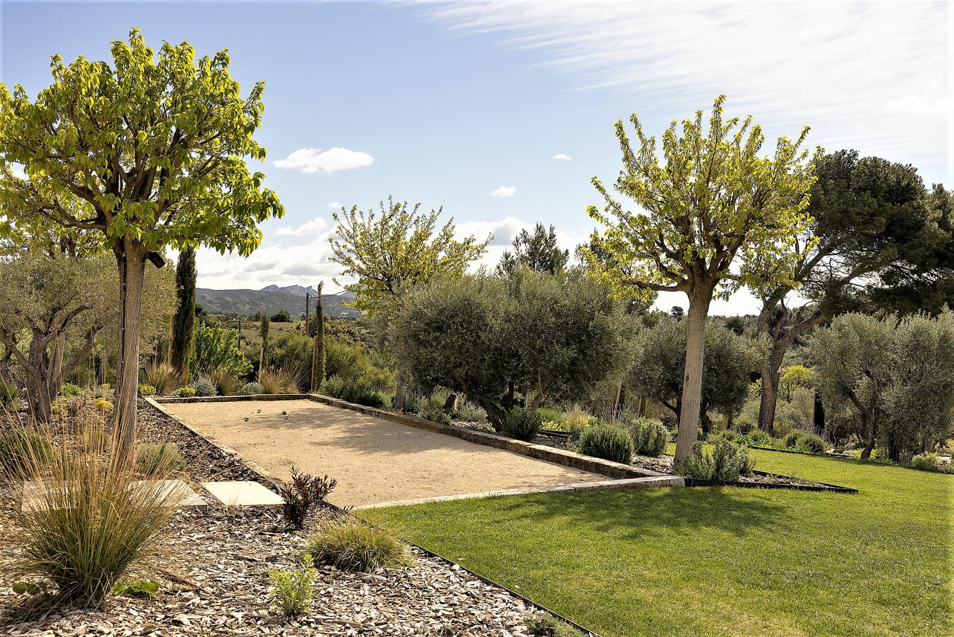 On the garden side, many facilities will welcome you according to your wishes: a 17x5 m heated swimming pool and its splendid and unique view of the Alpilles, a shaded pool house with bar and Pit Fire, a petanque court and numerous terraces suitable for relaxation.