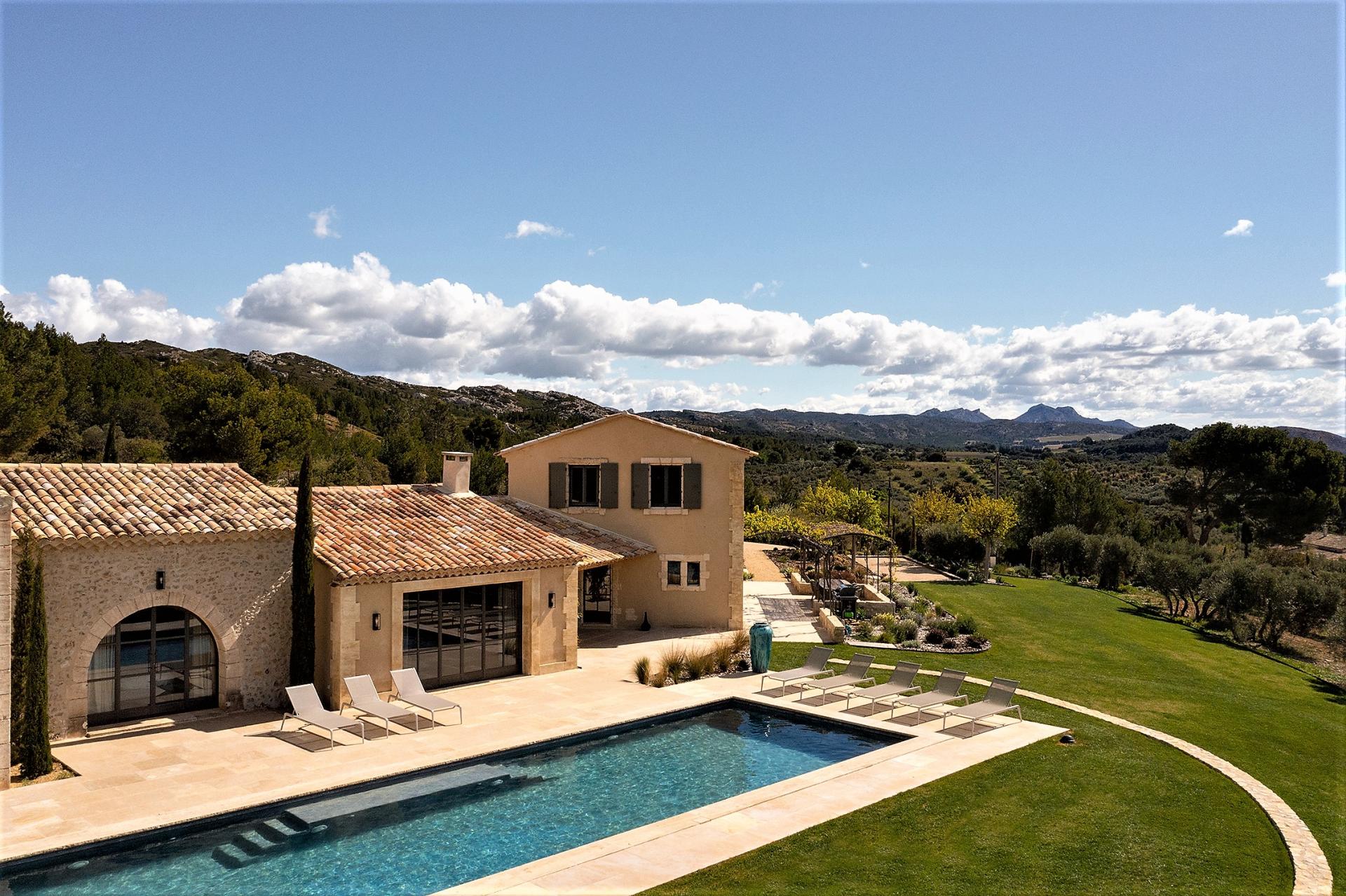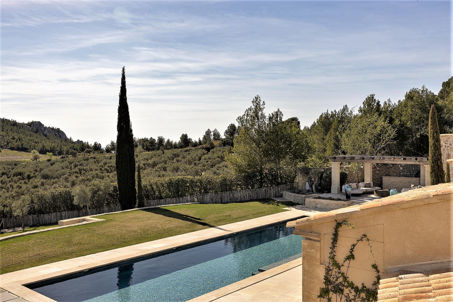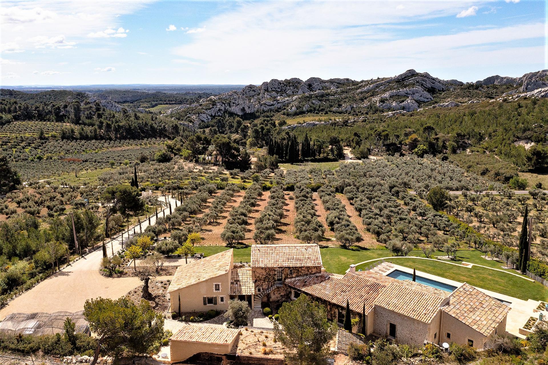 Located 5 minutes from the village of Maussane, with a dominant view of the surrounding hills and olive groves, this 400 m2 property is an invitation to serenity, calm and nature with its 1 hectare garden nestled in the heart of the Alpilles Natural Park.