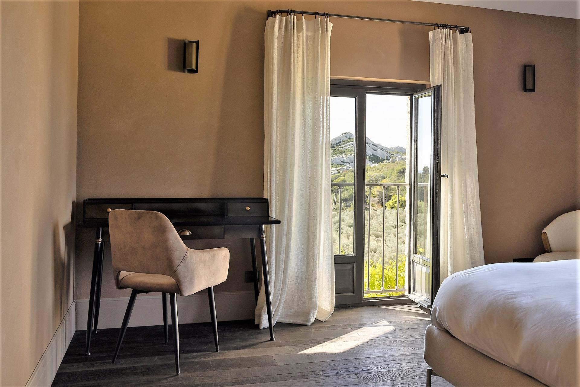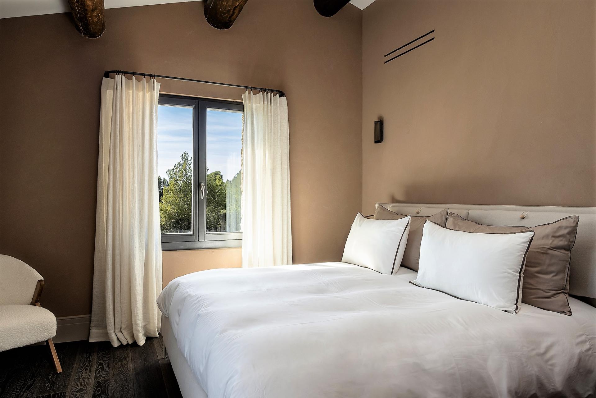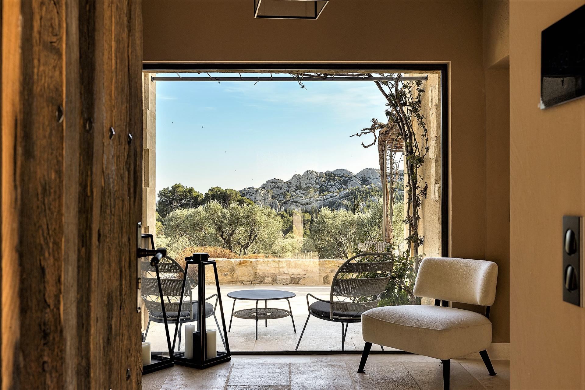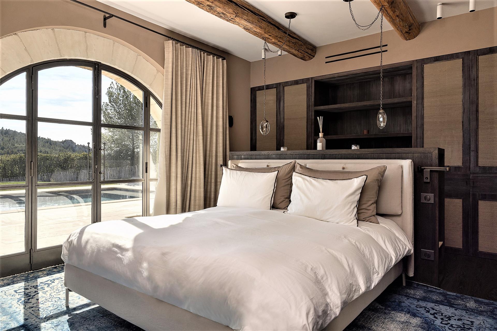 A spacious 65m2 living room with fireplace opens onto the Alpilles and the swimming pool, juxtaposing a spacious suite with direct access to the swimming pool. Two other en-suite bedrooms in the annex will accomodate your guests.