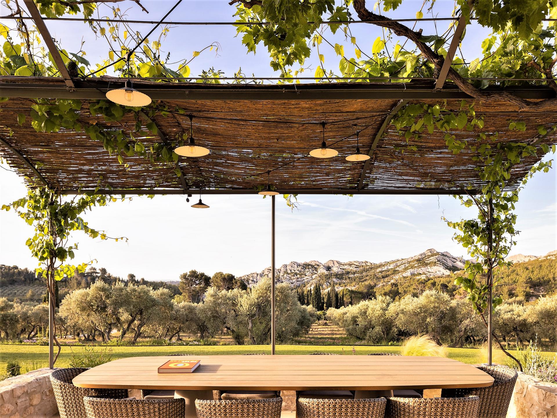 A pleasant arbor with its vine for shaded meals with a unique view of the hills and fields of olive trees. The Alpilles are everywhere around you.