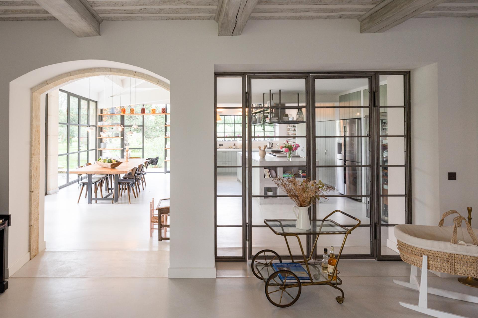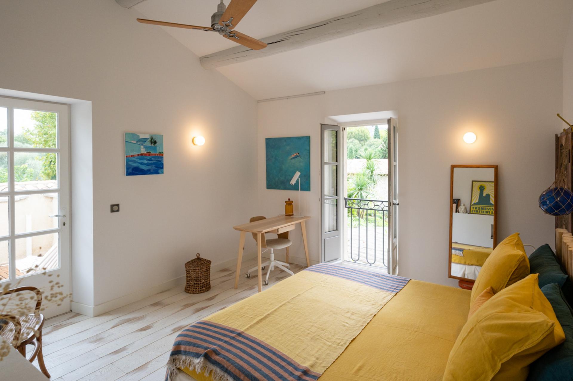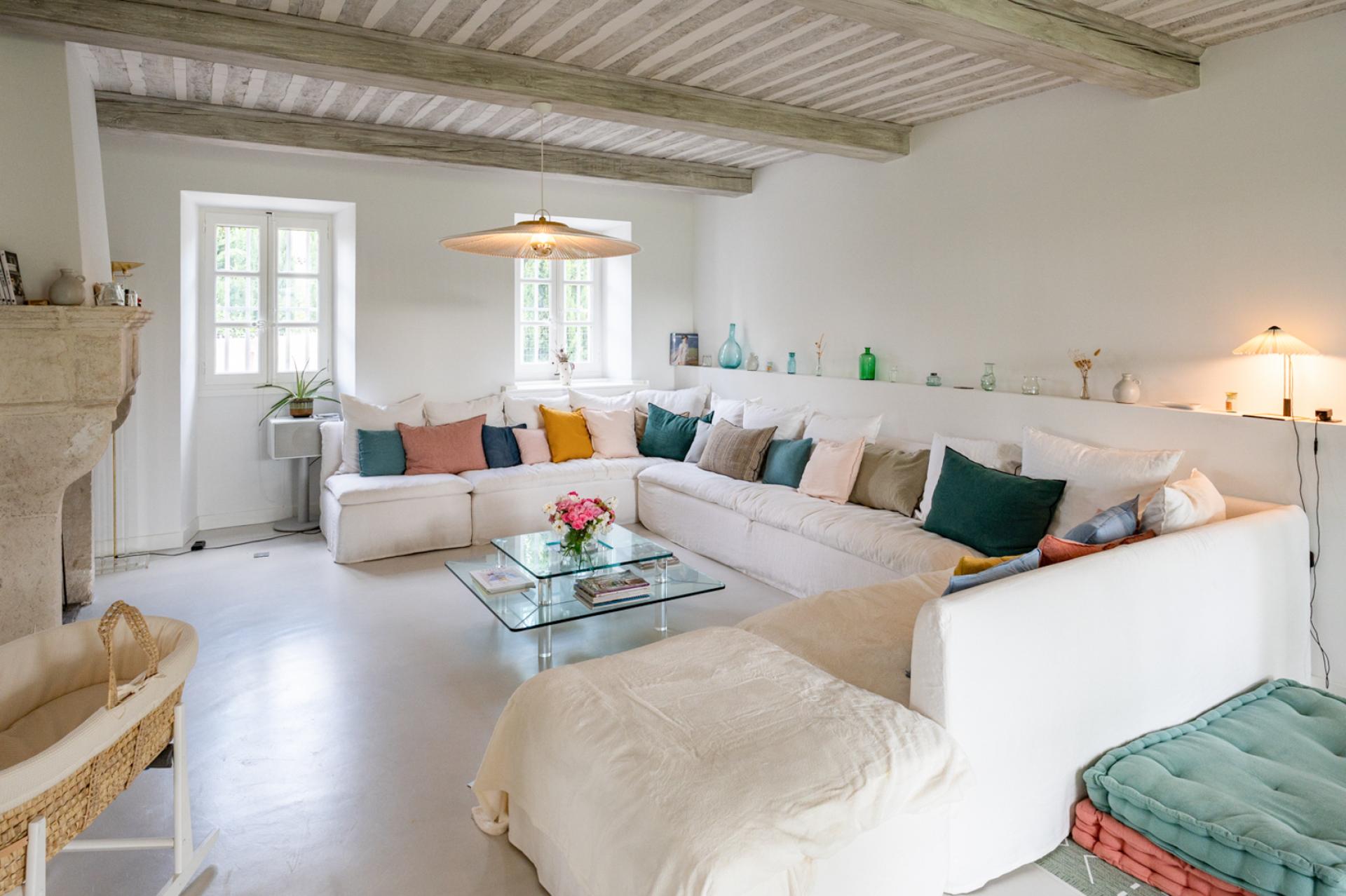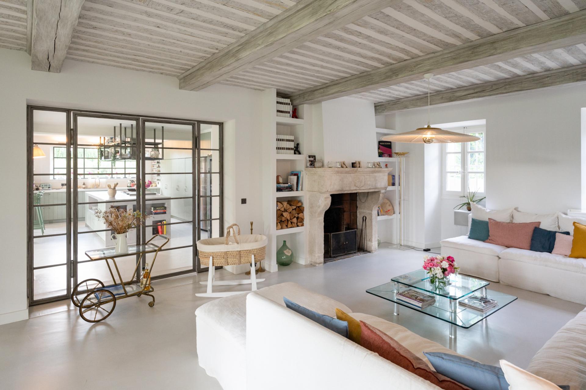 Passing the front door of Mas Elegance, the layout and its decoration strike you with its clarity and originality. The entrance is bright and separates the living spaces, night spaces and access to the upper floor. The staircase also has some similarity to that of the Guggenheim Museum.