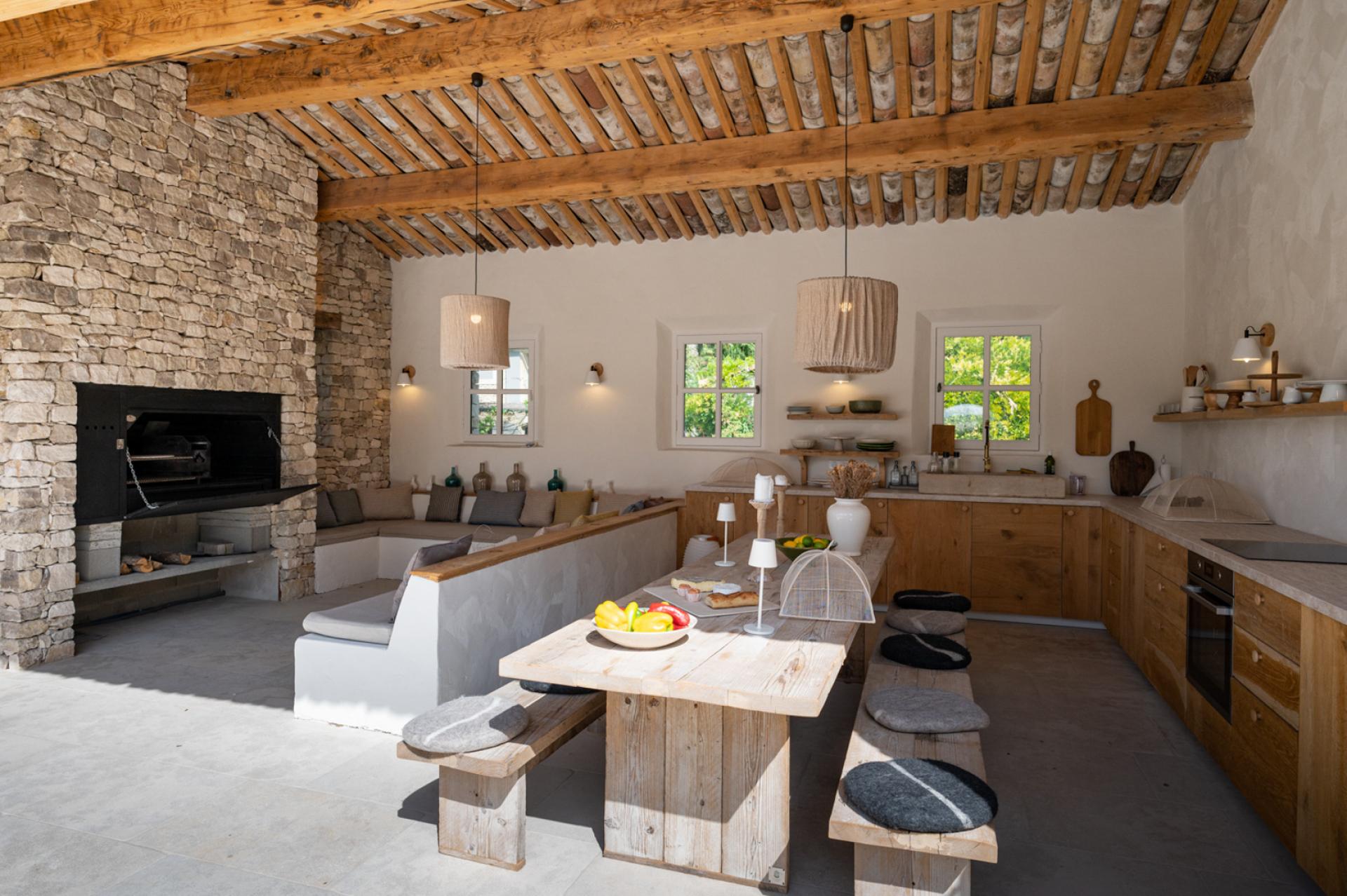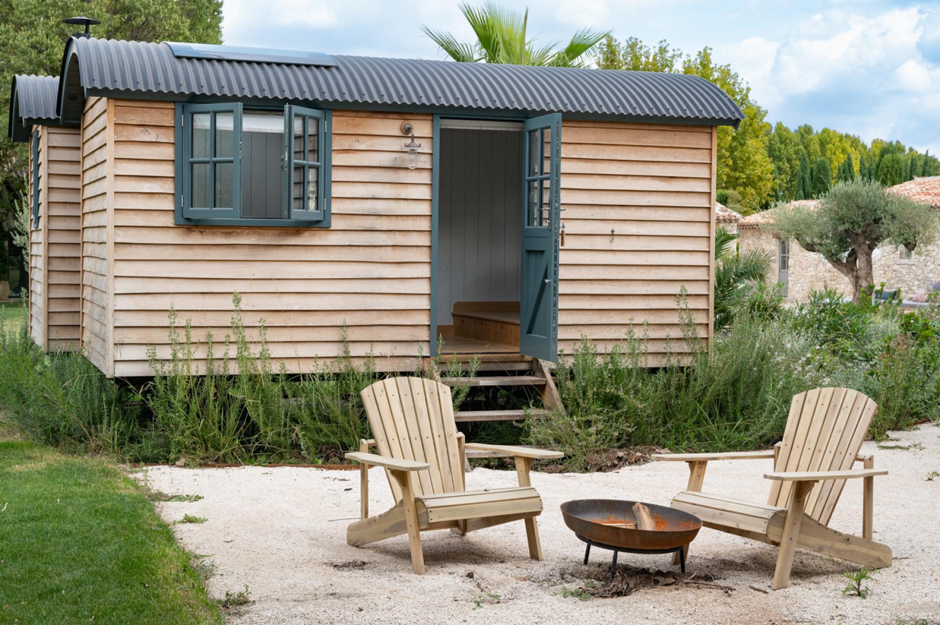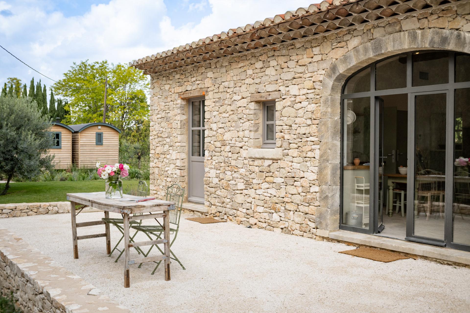 Further on, there is a 12 x 5 heated swimming pool which has a system of removable wooden barriers to protect access to the youngest if necessary. Several dry-stone buildings of the most beautiful finish are nearby. There is a very well-equipped pool house, outdoor WC and shower, a fitness room and a mazet with a double bedroom en suite, with living room and kitchen. As well as a caravan with New England decoration, which has a double bedroom with its open bathtub, a kitchenette opening onto a living room with fireplace insert and a shower room and WC.