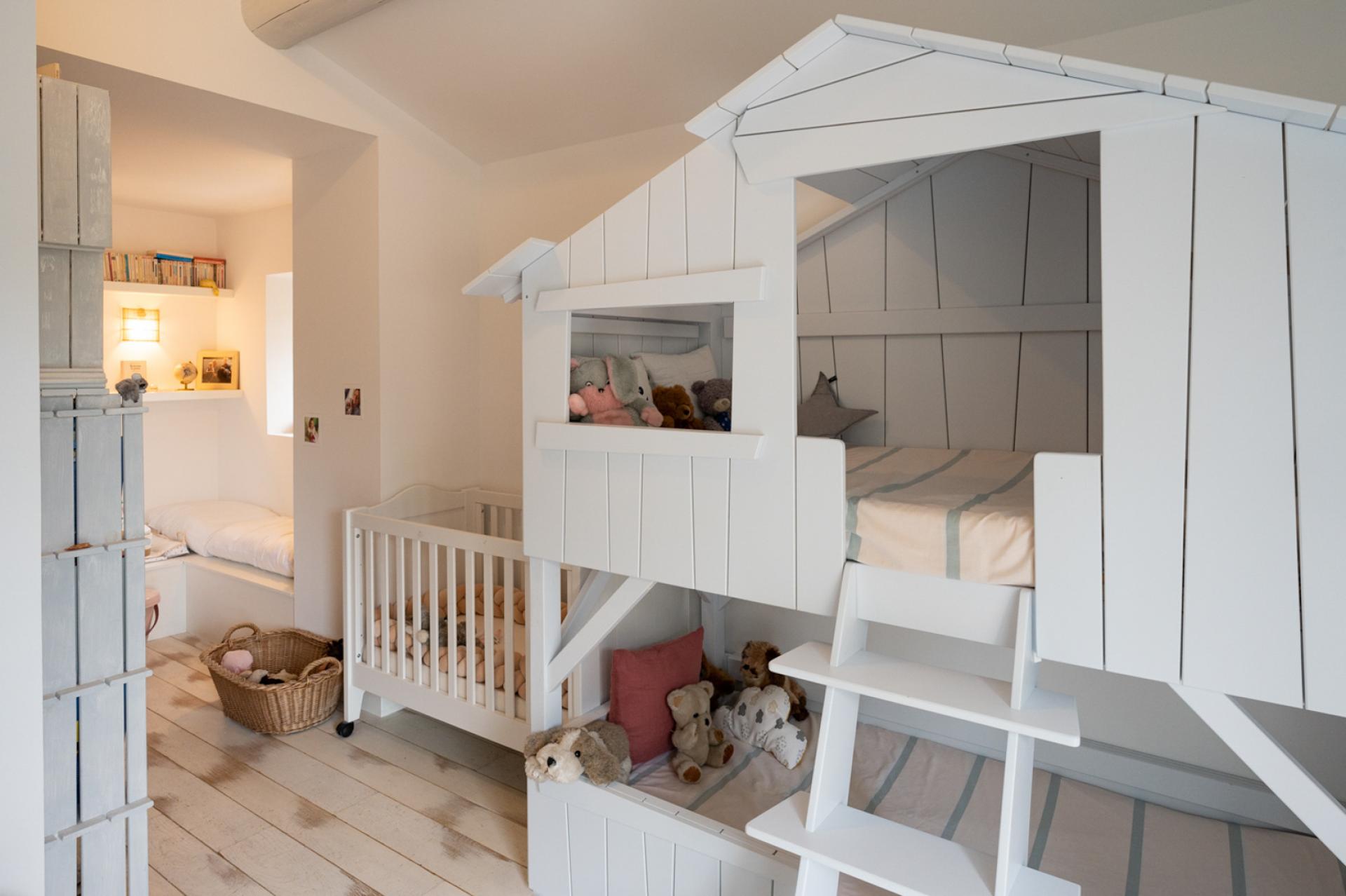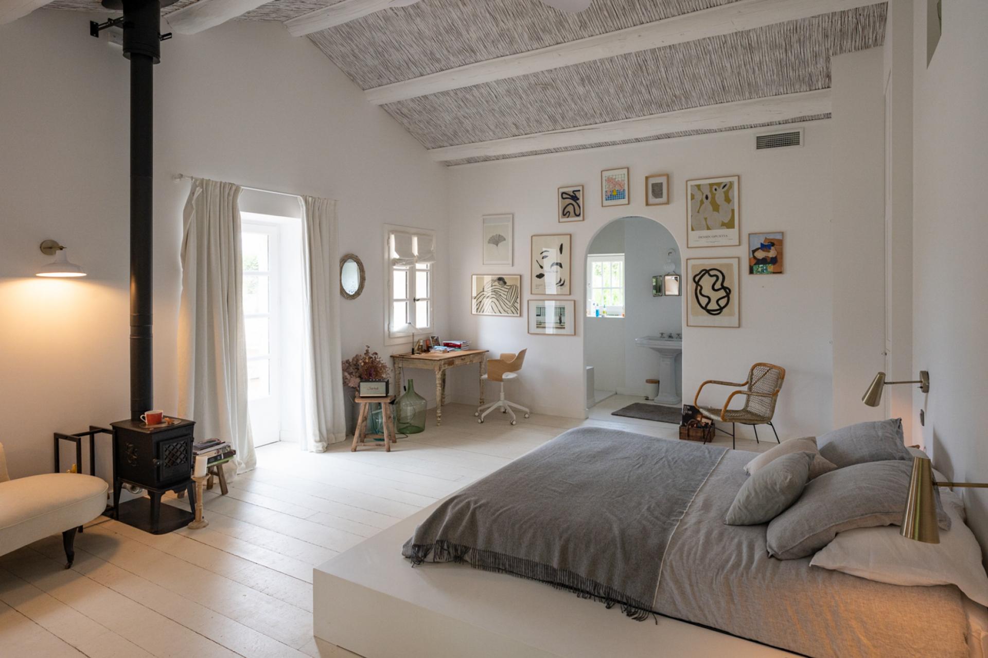 Upstairs is a master suite with a double bedroom, a children's bedroom with two bunk beds, both sharing a bathroom. The master bedroom, located at the other end of the farmhouse, has a double bed, a shower room and a balcony overlooking the olive grove.