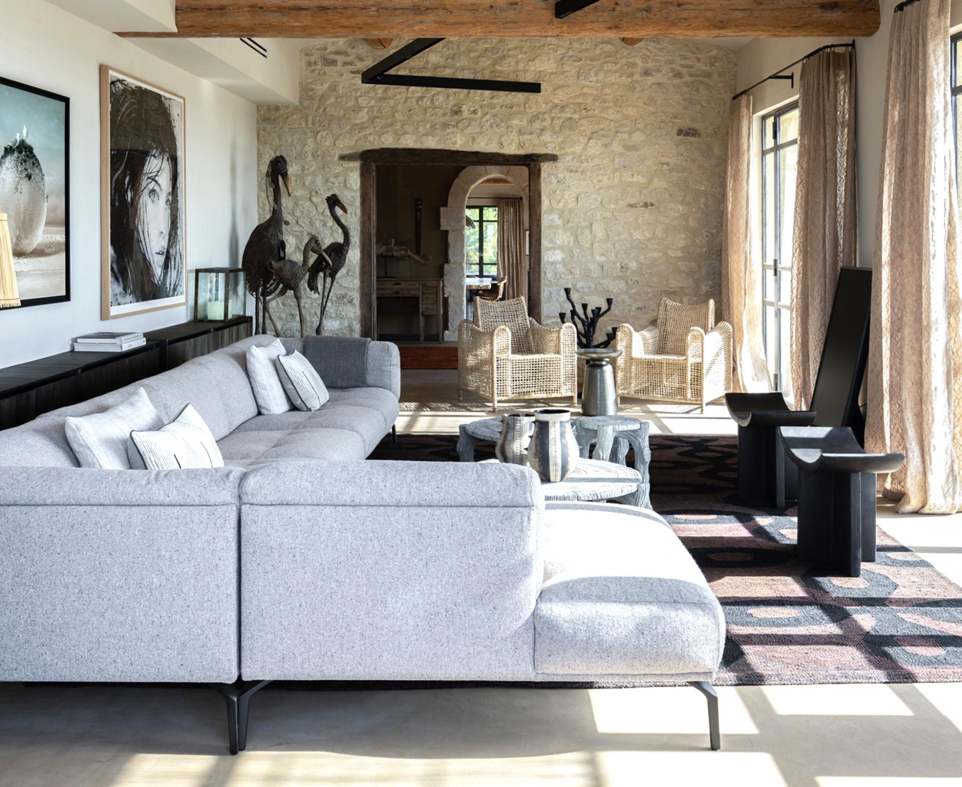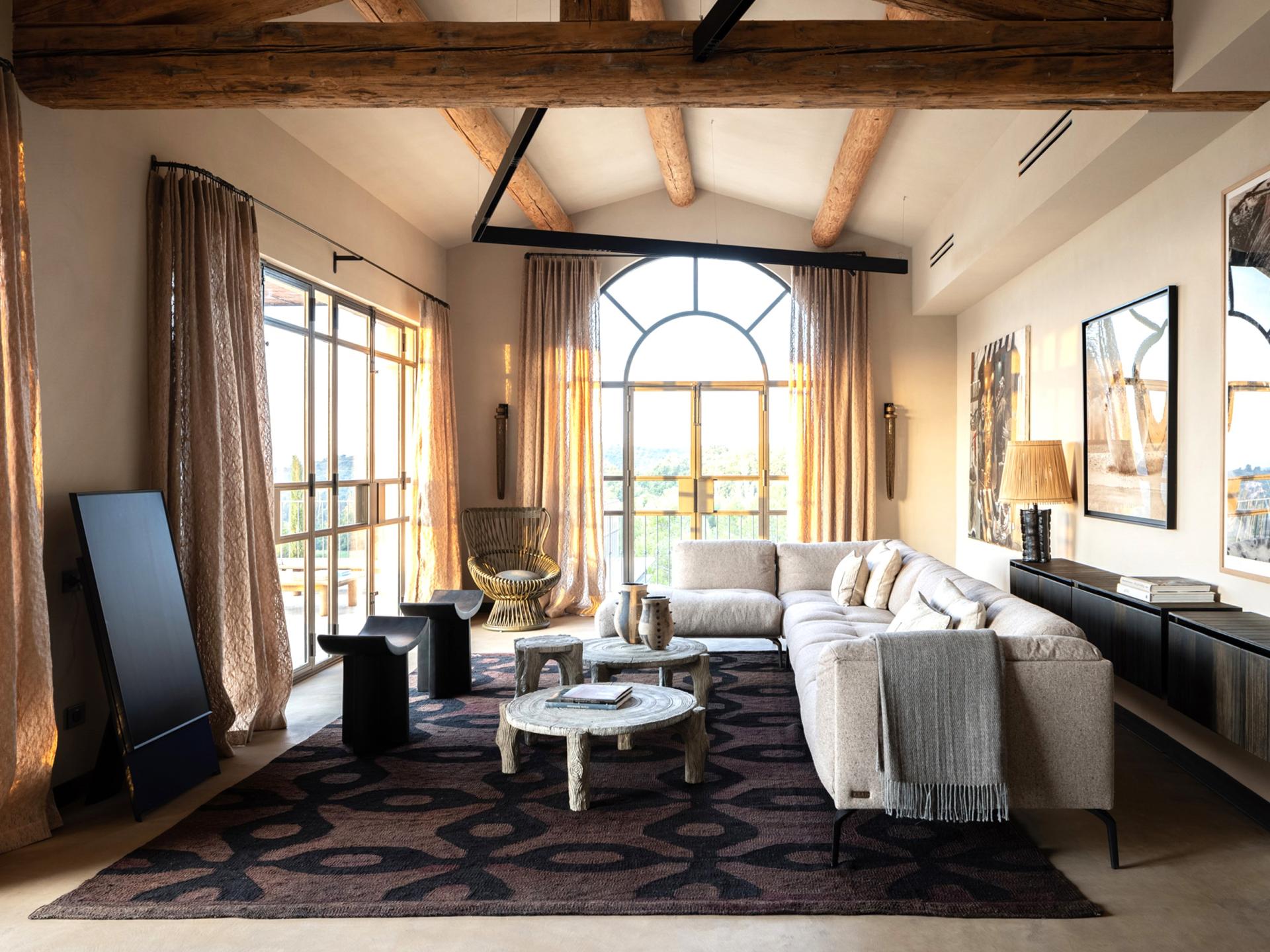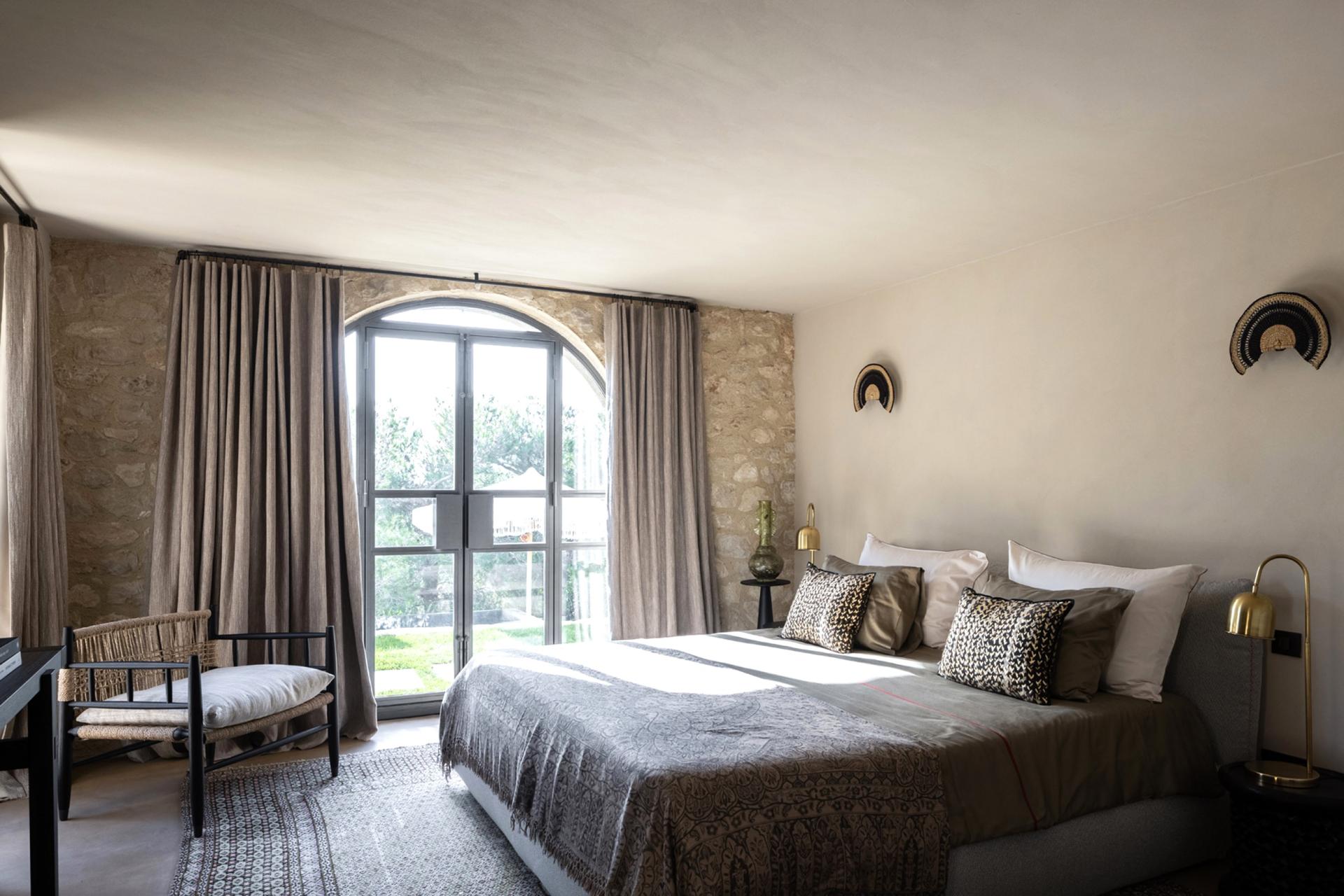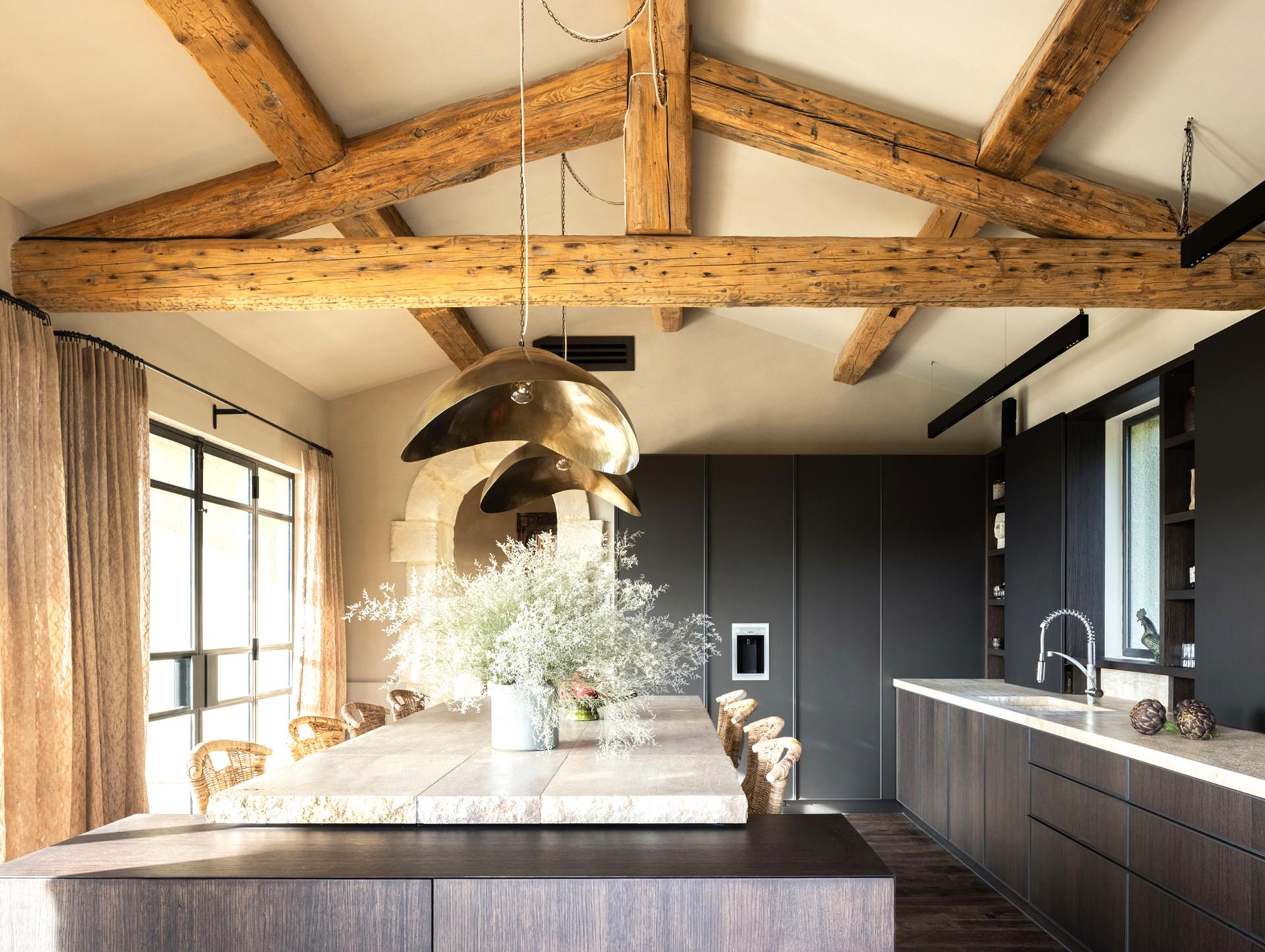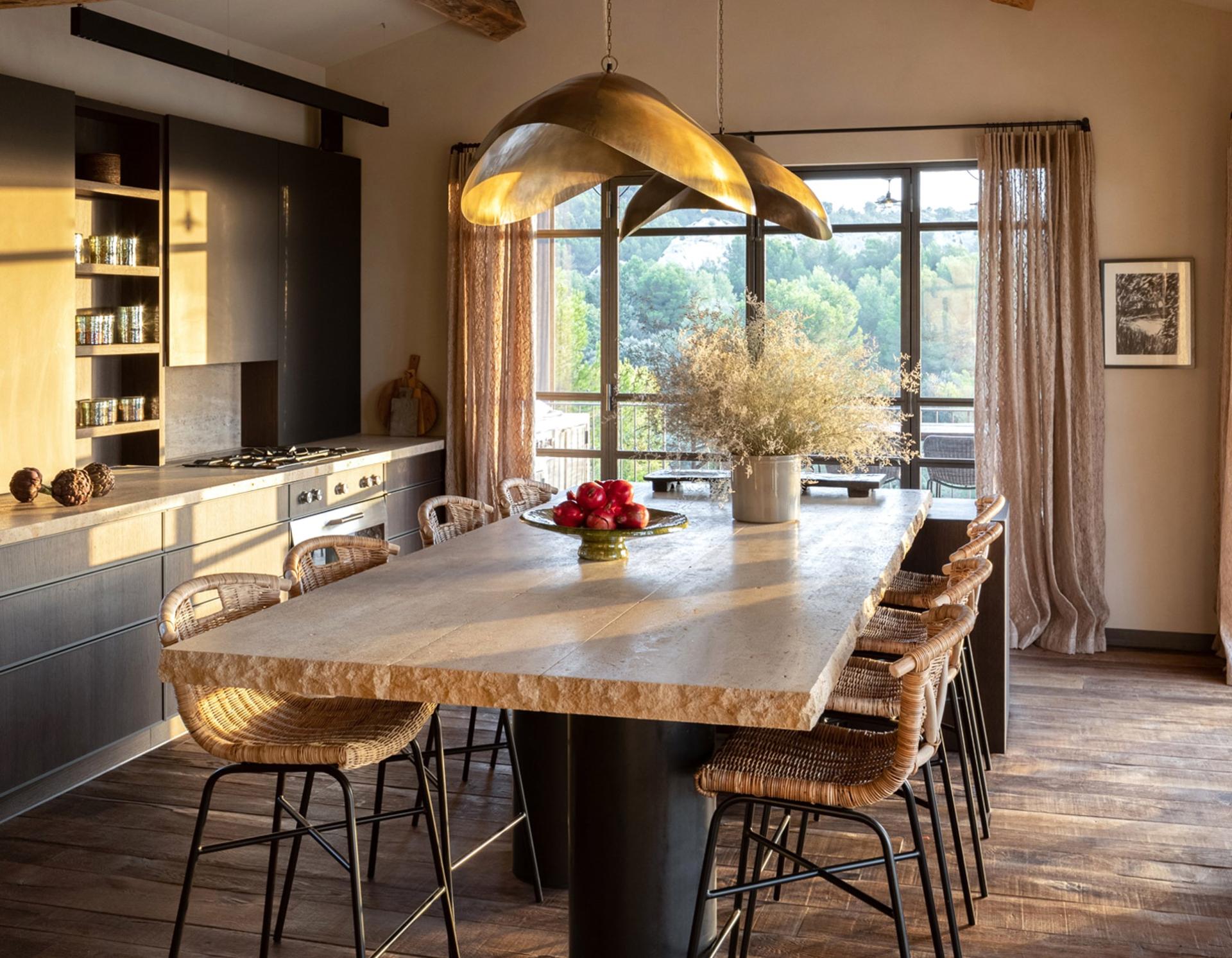 The ground floor has a large kitchen and a spacious living room, with beautiful windows, which give direct access to the terraces of over 150m2 offering a bird's eye view of the Alpilles mountain range. On the kitchen side, the Mas has two shaded dining areas thanks to its wooden pergola. The interior decoration reflects perfectly the region and nature, everything is in harmony and contrast. Limestone from Les Baux and dark oak floors, antique-looking carpentry, and ironwork on the stone facade, gilded by the sun.
