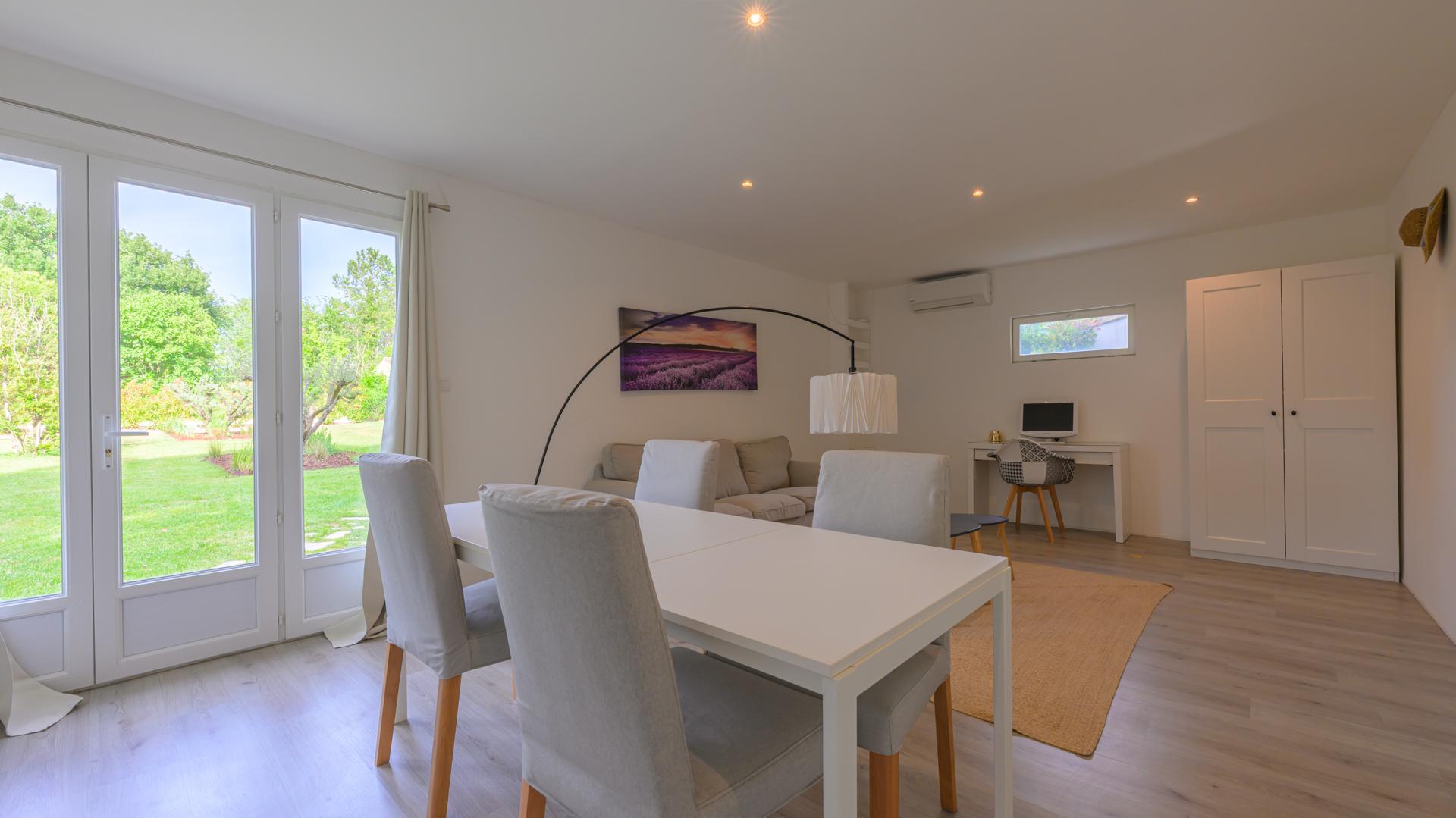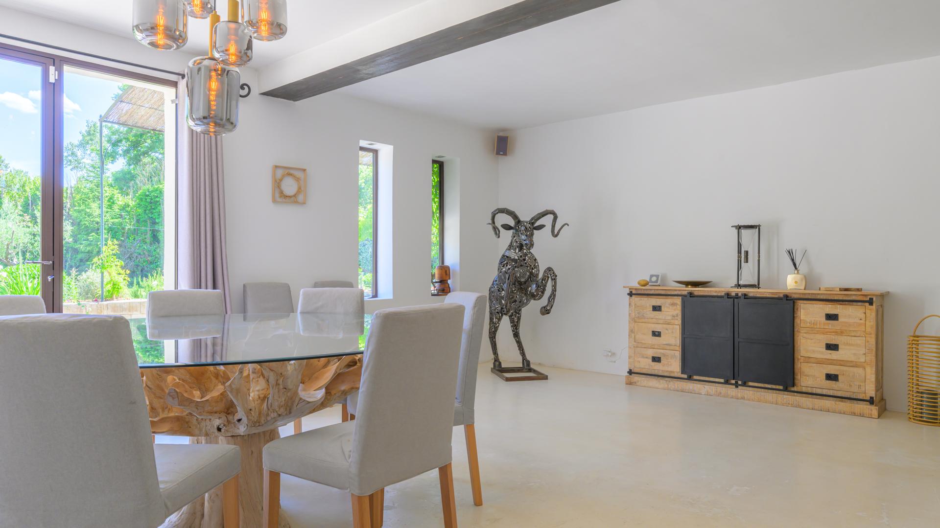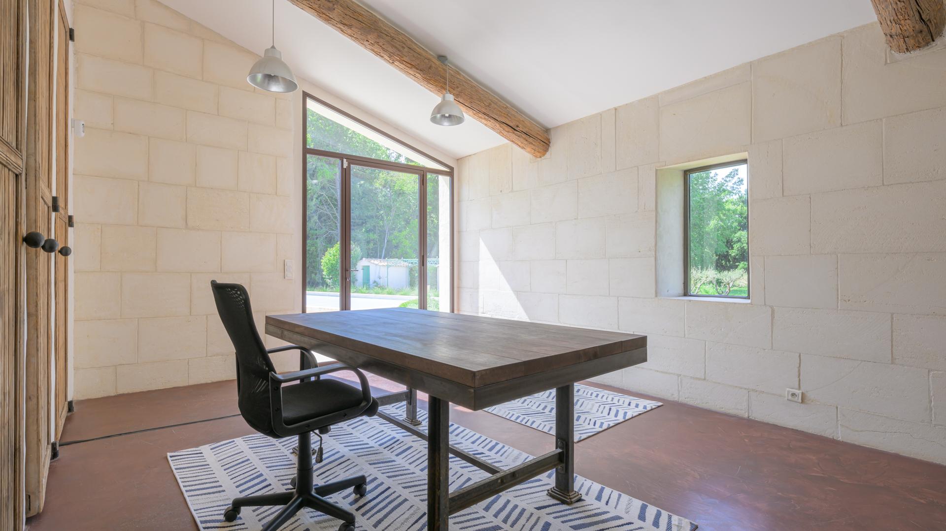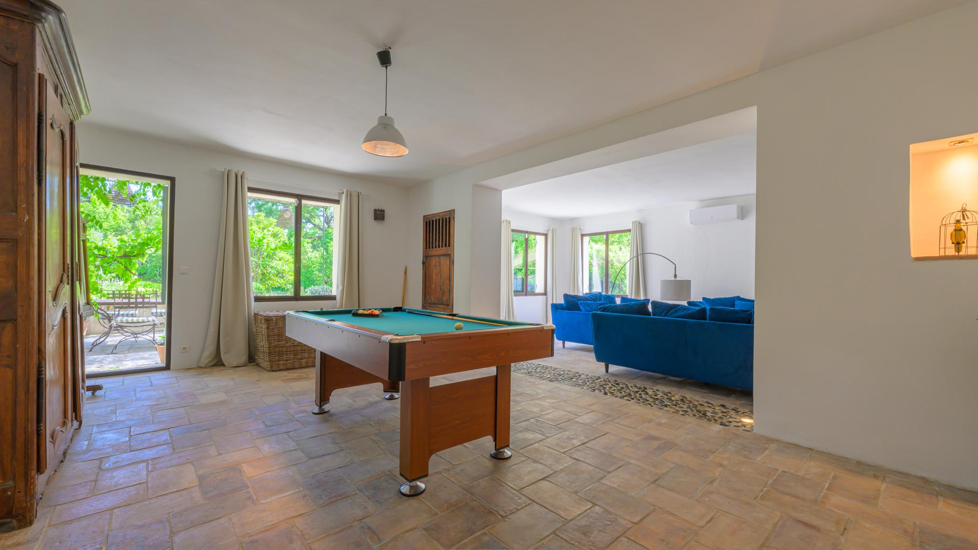 The interiors of both the mas and annex are spacious and contemporary in both décor and furnishings. The ground floor of the former comprises, an entrance hall with guest WC, a modern well-equipped kitchen and back kitchen, a dining room seating twelve, a welcoming living room, all of which open onto the terrace and front garden, whilst to the rear of the ground floor includes, an office and large TV room. Upstairs features the four double bedrooms all of which are en-suite and a kids living/play area.