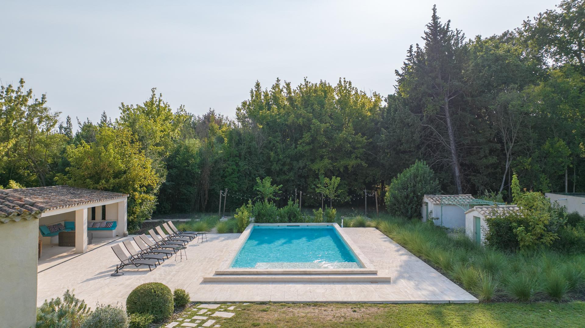 A recently renovated mas, located on the outskirts and within walking distance to the centre of St Remy de Provence. It is hidden from view surrounded by woodland, set in flourishing gardens of over one and half hectares, featuring a heated and covered swimming pool of 11 x 5m in size, a pool house, a large south facing terrace to the front of the property and two attractive fountains.