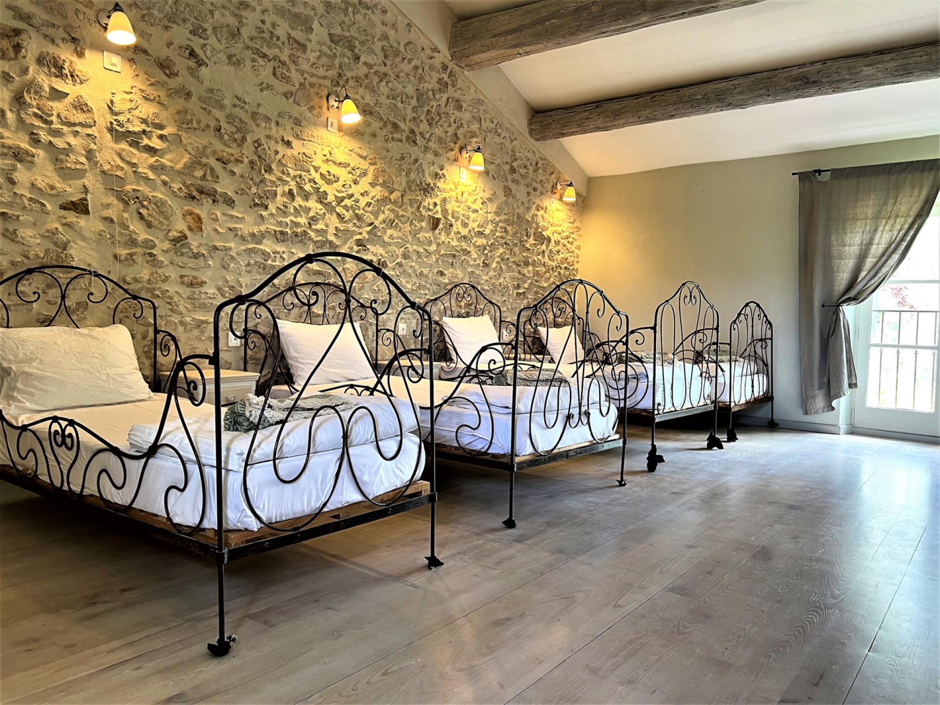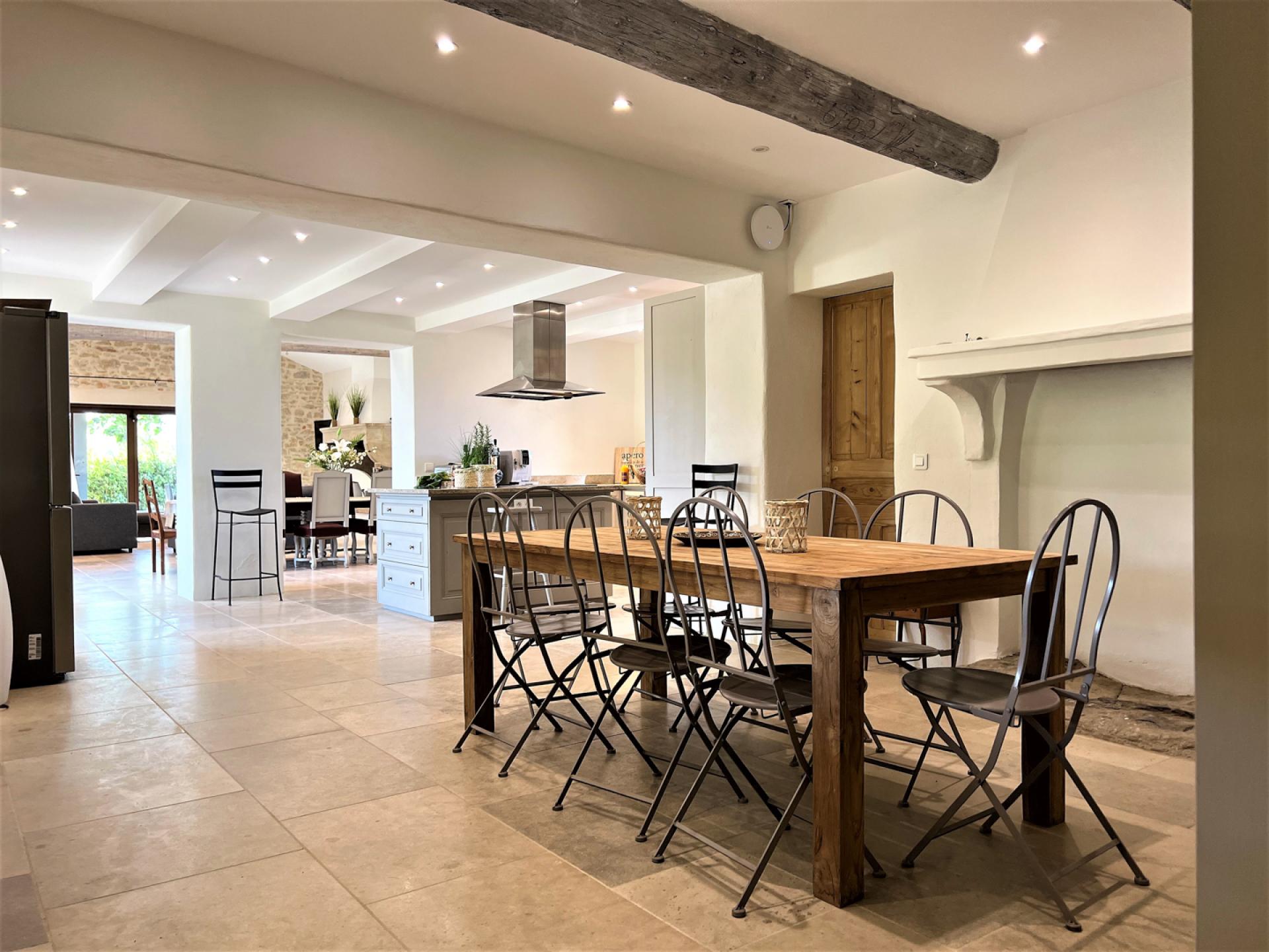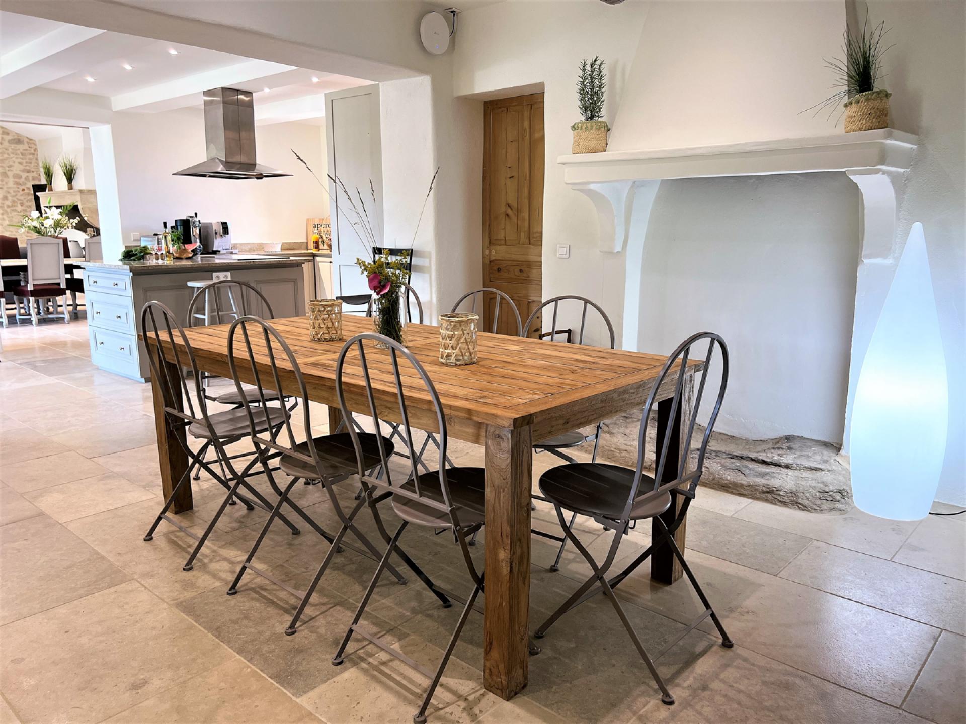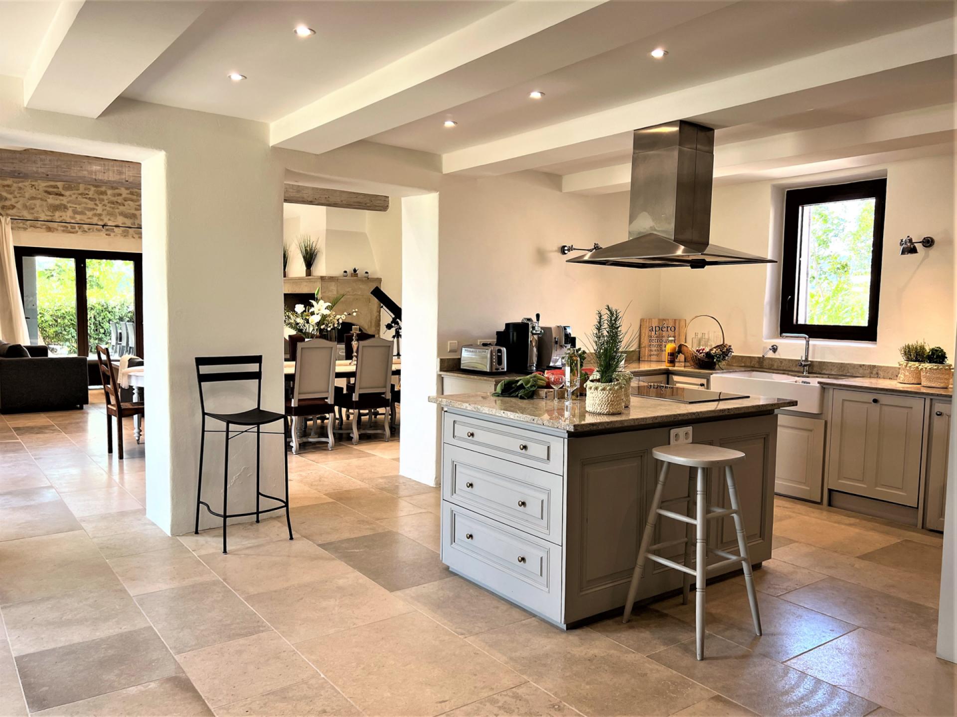 The ground floor comprises of, a large entrance hall with guest WC, laundry room with washing machine, dryer, large fridge freezer, a well-equipped American kitchen (American fridge, central island, induction oven, oven, microwave, Delonghi coffee machine, toaster, robots), dishwasher, a dining area with table and 8 chairs, a large living room with fireplace, TV, sofas, a dining area with table and 10 chairs, two bedrooms, one double and a twin bedded room and a shared bathroom. Whilst on the first floor, there is a long hallway with four bedrooms, including a dormitory with four beds and three bathrooms and a guest WC.