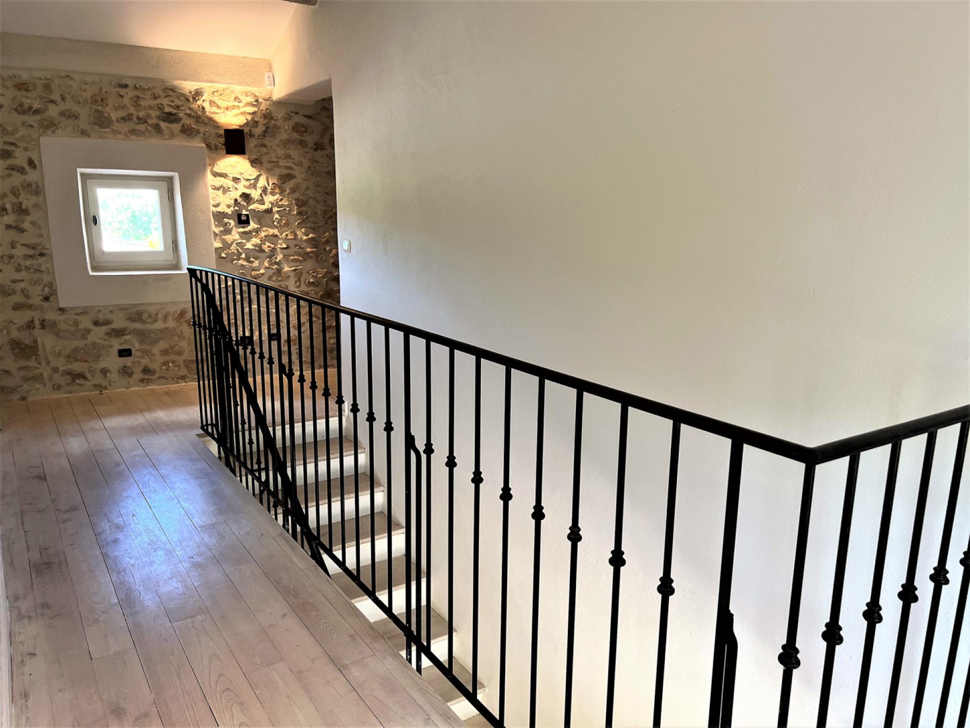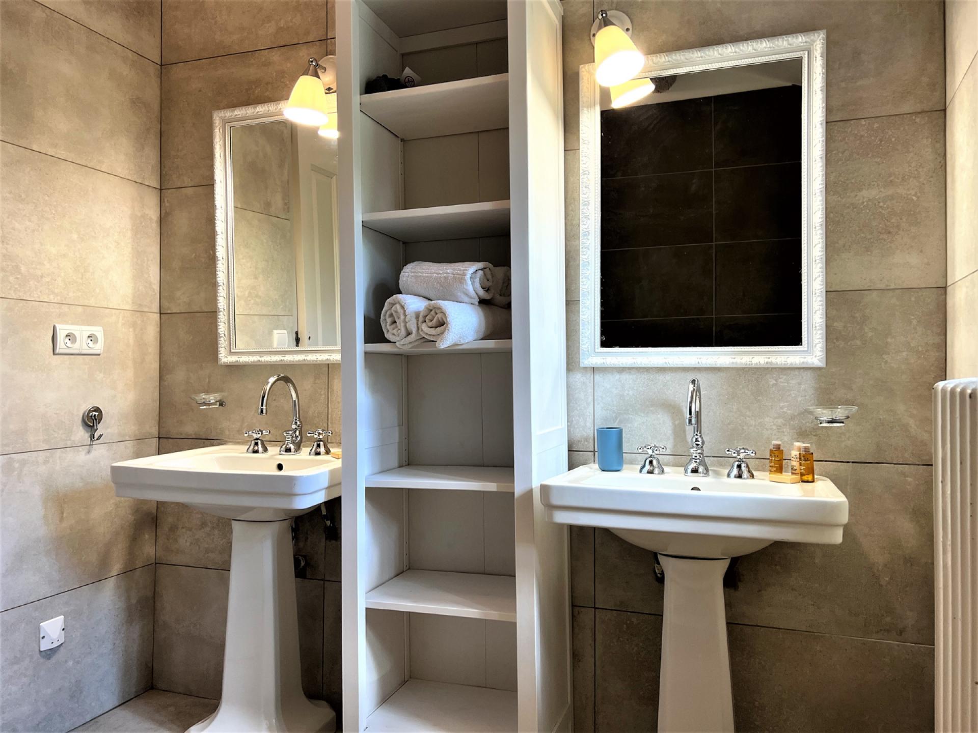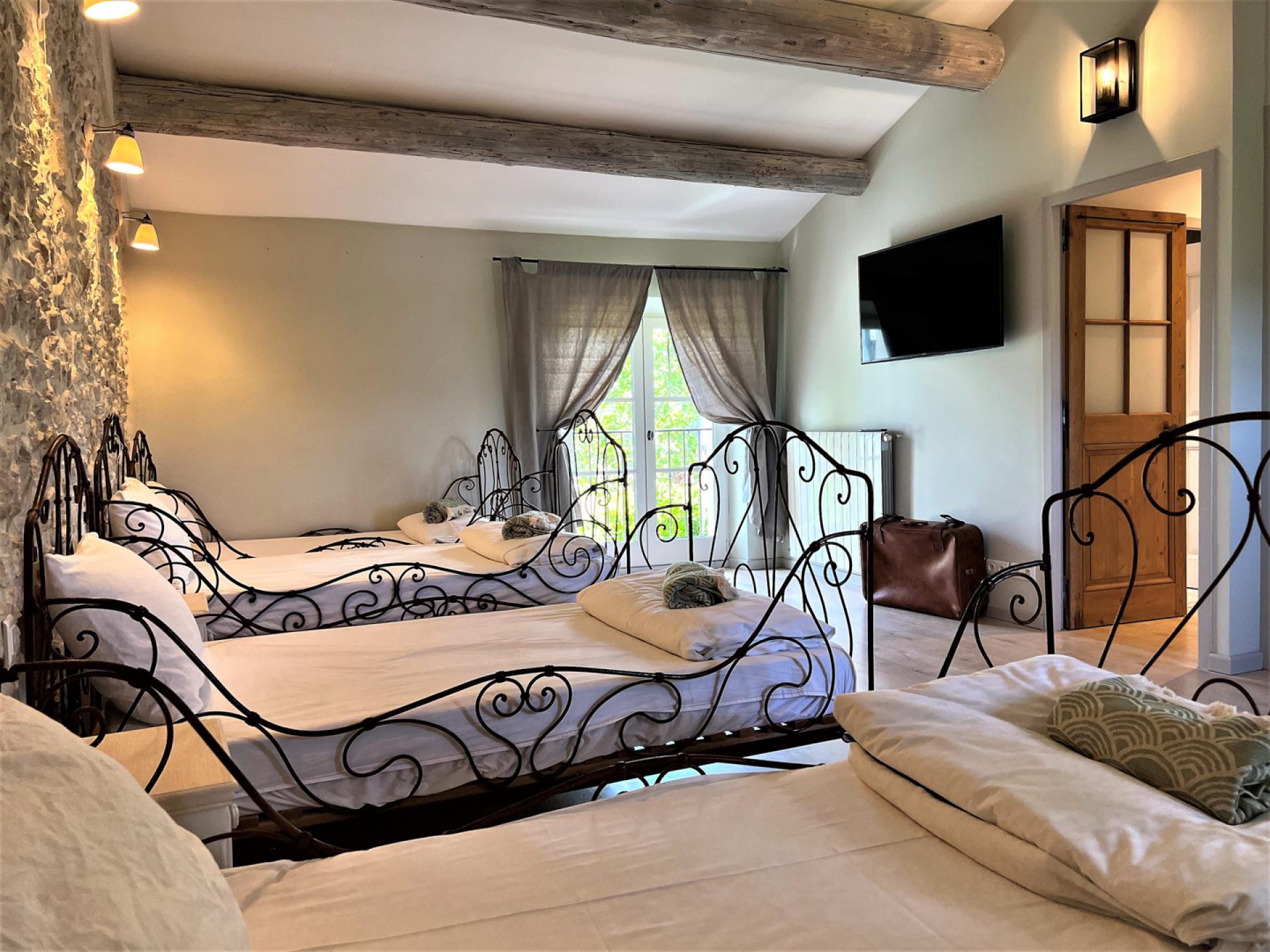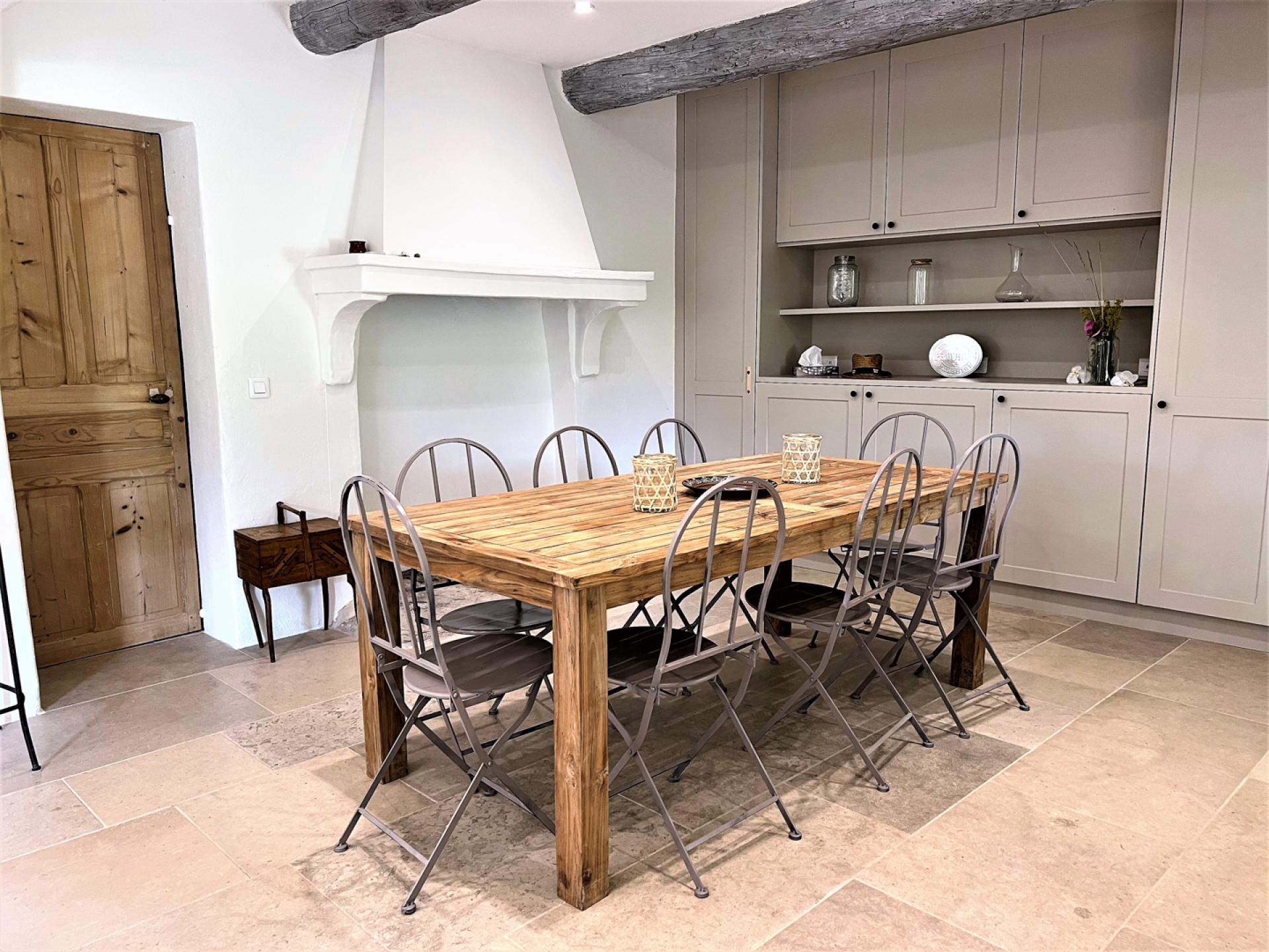 The ground floor comprises of, a large entrance hall with guest WC, laundry room with washing machine, dryer, large fridge freezer, a well-equipped American kitchen (American fridge, central island, induction oven, oven, microwave, Delonghi coffee machine, toaster, robots), dishwasher, a dining area with table and 8 chairs, a large living room with fireplace, TV, sofas, a dining area with table and 10 chairs, two bedrooms, one double and a twin bedded room and a shared bathroom. Whilst on the first floor, there is a long hallway with four bedrooms, including a dormitory with four beds and three bathrooms and a guest WC.